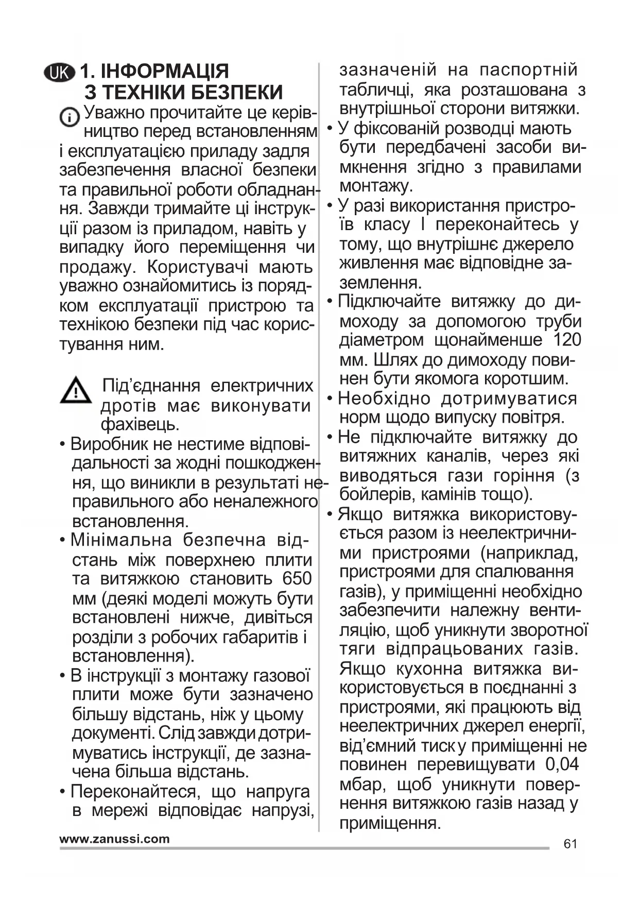 - Якщо витяжка використову- ється разом із неелектрични- ми пристроями (наприклад, пристроями для спалювання газів), у приміщенні необхідно забезпечити належну венти- ляцію, щоб уникнути зворотної тяги відпрацьованих газів. Якщо кухонна витяжка ви- користовується в поєднанні з пристроями, які працюють від неелектричних джерел енергії, від’ємний тиск у приміщенні не повинен перевищувати 0,04 мбар, щоб уникнути повер- нення витяжкою газів назад у приміщення. UK62 www.zanussi.com