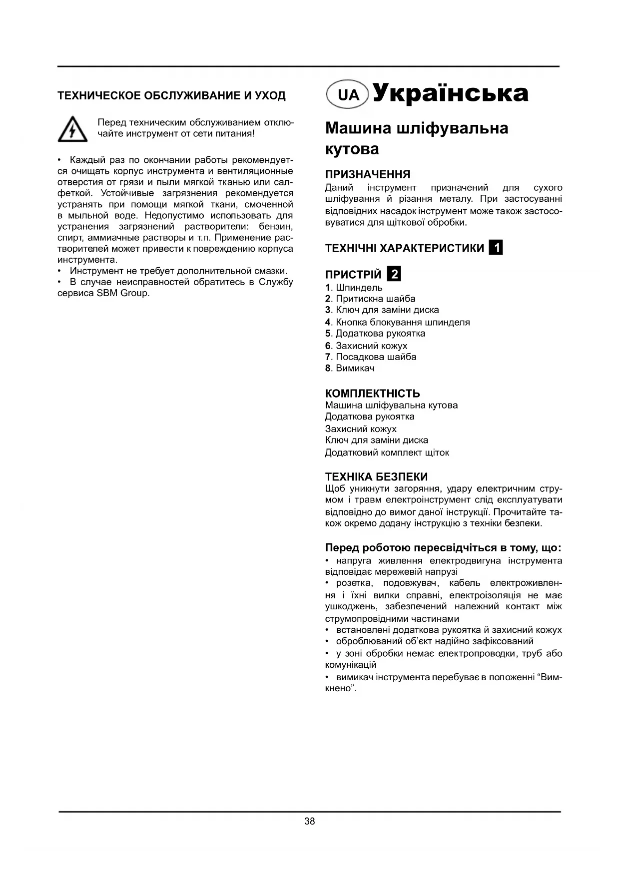КОМПЛЕКТНІСТЬ Машина шліфувальна кутова Додаткова рукоятка Захисний кожух Ключ для заміни диска Додатковий комплект щіток ТЕХНІКА БЕЗПЕКИ Щоб уникнути загоряння, удару електричним стру- мом і травм електроінструмент слід експлуатувати відповідно до вимог даної інструкції. Прочитайте та- кож окремо додану інструкцію з техніки безпеки. Перед роботою пересвідчіться в тому, що: