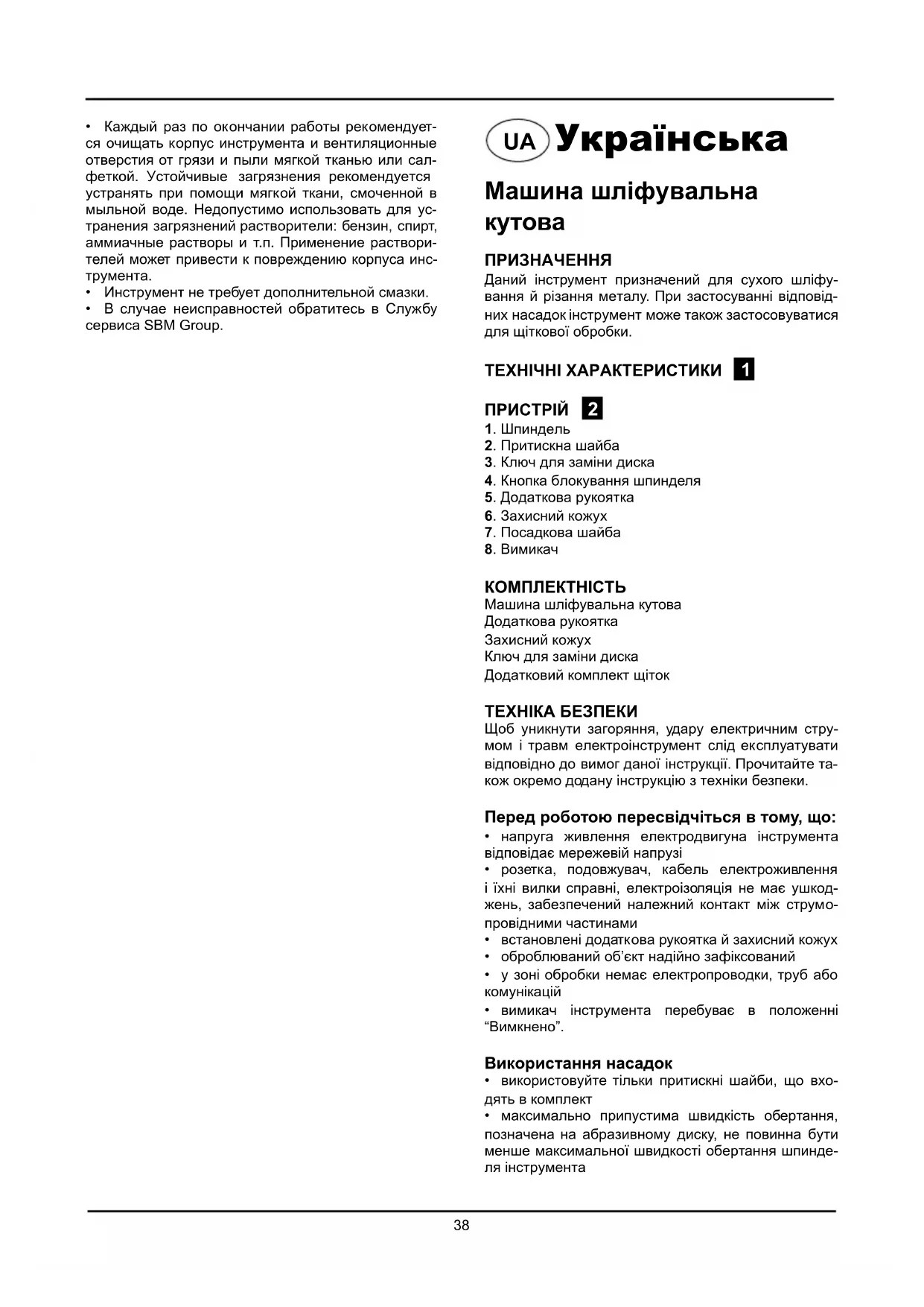 КОМПЛЕКТНІСТЬ Машина шліфувальна кутова Додаткова рукоятка Захисний кожух Ключ для заміни диска Додатковий комплект щіток ТЕХНІКА БЕЗПЕКИ Щоб уникнути загоряння, удару електричним стру- мом і травм електроінструмент слід експлуатувати відповідно до вимог даної інструкції. Прочитайте та- кож окремо додану інструкцію з техніки безпеки. Перед роботою пересвідчіться в тому, що: