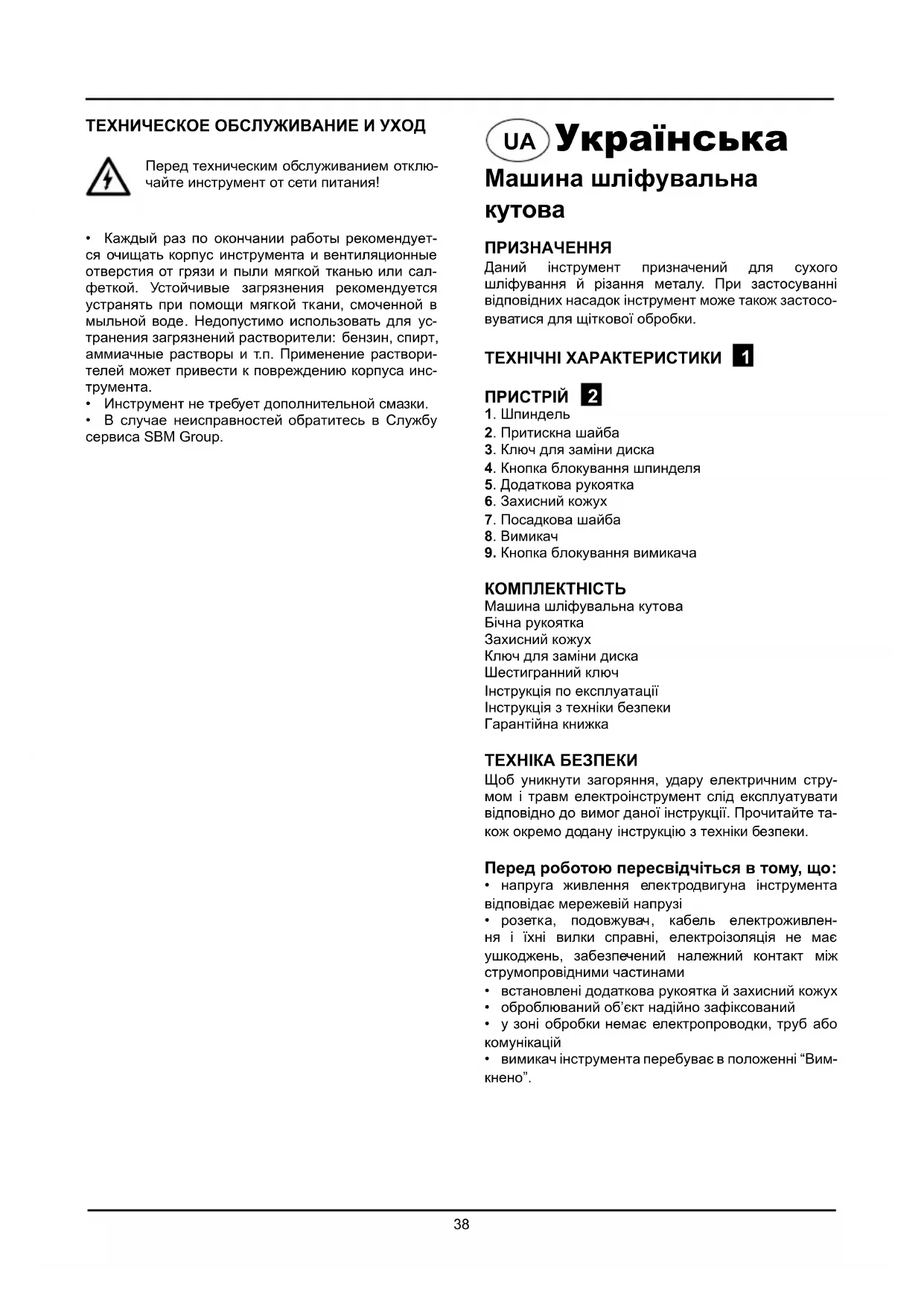 КОМПЛЕКТНІСТЬ Машина шліфувальна кутоваБічна рукояткаЗахисний кожух Ключ для замiни диска Шестигранний ключІнструкція по експлуатаціїІнструкція з техніки безпекиГарантійна книжка ТЕХНІКА БЕЗПЕКИ Щоб уникнути загоряння, удару електричним стру- мом і травм електроінструмент слід експлуатувати відповідно до вимог даної інструкції. Прочитайте та- кож окремо додану інструкцію з техніки безпеки. Перед роботою пересвідчіться в тому, що: