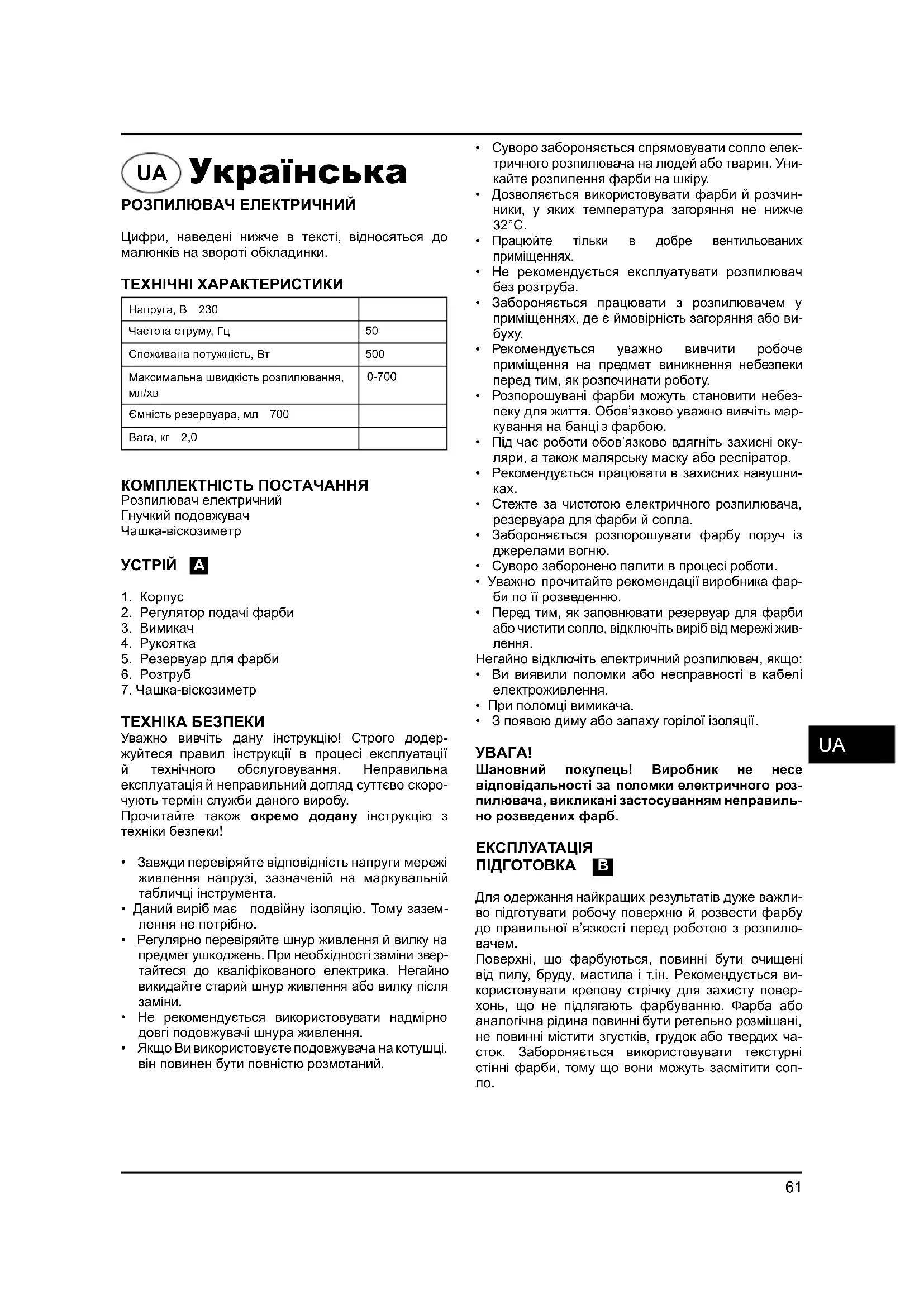 Шановний покупець! Виробник не несе відповідальності за поломки електричного роз- пилювача, викликані застосуванням неправиль- но розведених фарб. ЕКСПЛУАТАЦІЯ ПІДГОТОВКА B Для одержання найкращих результатів дуже важли- во підготувати робочу поверхню й розвести фарбу до правильної в’язкості перед роботою з розпилю-