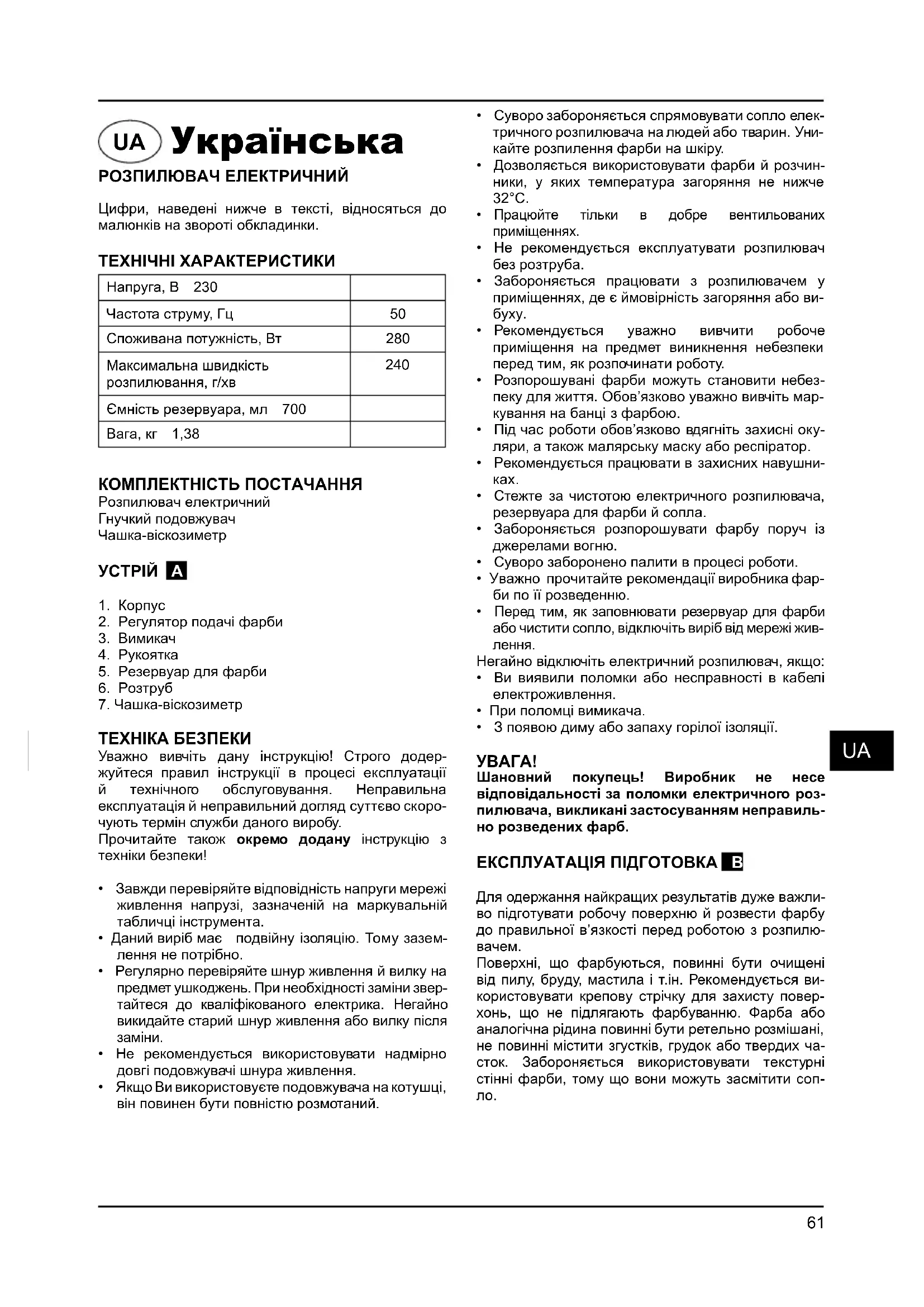 Шановний покупець! Виробник не несе відповідальності за поломки електричного роз- пилювача, викликані застосуванням неправиль- но розведених фарб. ЕКСПЛУАТАЦІЯ ПІДГОТОВКА B Для одержання найкращих результатів дуже важли- во підготувати робочу поверхню й розвести фарбу до правильної в’язкості перед роботою з розпилю-