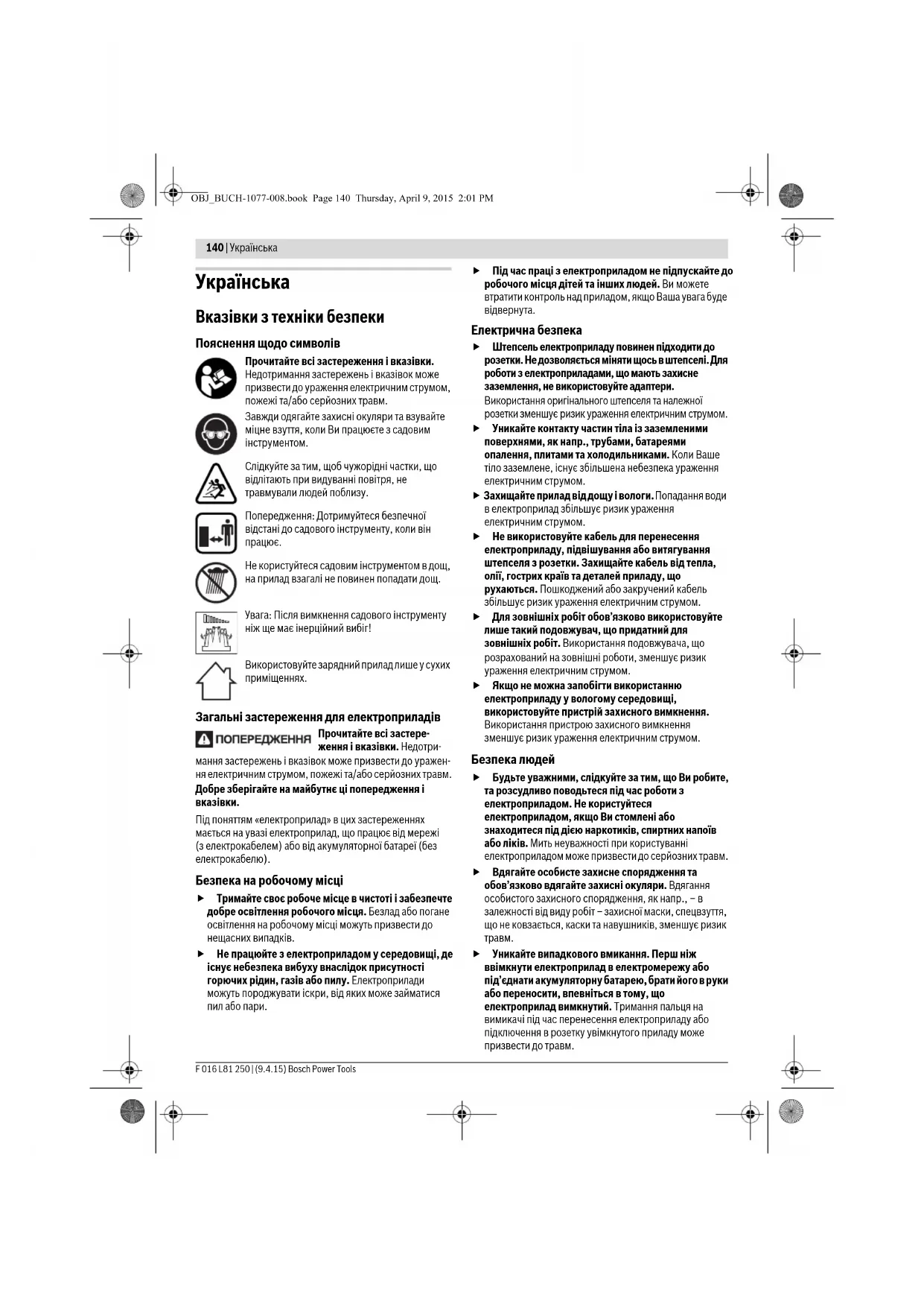 Уникайте випадкового вмикання. Перш ніж ввімкнути електроприлад в електромережу або під’єднати акумуляторну батарею, брати його в руки або переносити, впевніться в тому, що електроприлад вимкнутий. Тримання пальця на вимикачі під час перенесення електроприладу або підключення в розетку увімкнутого приладу може призвести до травм. OBJ_BUCH-1077-008.book Page 140 Thursday, April 9, 2015 2:01 PMУкраїнська | 141 Bosch Power Tools F 016 L81 250 | (9.4.15) Перед тим, як вмикати електроприлад, приберіть налагоджувальні інструменти та гайковий ключ. Перебування налагоджувального інструмента або ключа в частині приладу, що обертається, може призвести до травм. Уникайте неприродного положення тіла. Зберігайте стійке положення та завжди зберігайте рівновагу. Це дозволить Вам краще зберігати контроль над електроприладом у несподіваних ситуаціях. Вдягайте придатний одяг. Не вдягайте просторий одяг та прикраси. Не підставляйте волосся, одяг та рукавиці до деталей приладу, що рухаються. Про- сторий одяг, довге волосся та прикраси можуть потрапити в деталі, що рухаються. Якщо існує можливість монтувати пи- ловідсмоктувальні або пилоуловлюючі пристрої, переконайтеся, щоб вони були добре під’єднані та правильно використовувалися. Використання пило- відсмоктувального пристрою може зменшити небезпеки, зумовлені пилом. Правильне поводження та користування електроприладами Не перевантажуйте прилад. Використовуйте такий прилад, що спеціально призначений для відповідної роботи. З придатним приладом Ви з меншим ризиком отримаєте кращі результати роботи, якщо будете працювати в зазначеному діапазоні потужності. Не користуйтеся електроприладом з пошкодженим вимикачем. Електроприлад, який не можна увімкнути або вимкнути, є небезпечним і його треба відремонтувати. Перед тим, як регулювати що-небудь на приладі, міняти приладдя або ховати прилад, витягніть штепсель із розетки та/або витягніть акумуляторну батарею. Ці попереджувальні заходи з техніки безпеки зменшують ризик випадкового запуску приладу. Ховайте електроприлади, якими Ви саме не користуєтесь, від дітей. Не дозволяйте користуватися електроприладом особам, що не знайомі з його роботою або не читали ці вказівки. У разі застосування недосвідченими особами прилади несуть в собі небезпеку. Старанно доглядайте за електроприладом. Перевіряйте, щоб рухомі деталі приладу бездоганно працювали та не заїдали, не були пошкодженими або настільки пошкодженими, щоб це могло вплинути на функціонування електроприладу. Пошкоджені деталі треба відремонтувати, перш ніж користуватися ними знов. Велика кількість нещасних випадків спричиняється поганим доглядом за електроприладами. Тримайте різальні інструменти нагостреними та в чистоті. Старанно доглянуті різальні інструменти з гострим різальним краєм менше застряють та легші в експлуатації. Використовуйте електроприлад, приладдя до нього, робочі інструменти т.і. відповідно до цих вказівок. Беріть до уваги при цьому умови роботи та спе- цифіку виконуваної роботи. Використання електроприладів для робіт, для яких вони не передбачені, може призвести до небезпечних ситуацій. Правильне поводження та користування приладами, що працюють на акумуляторних