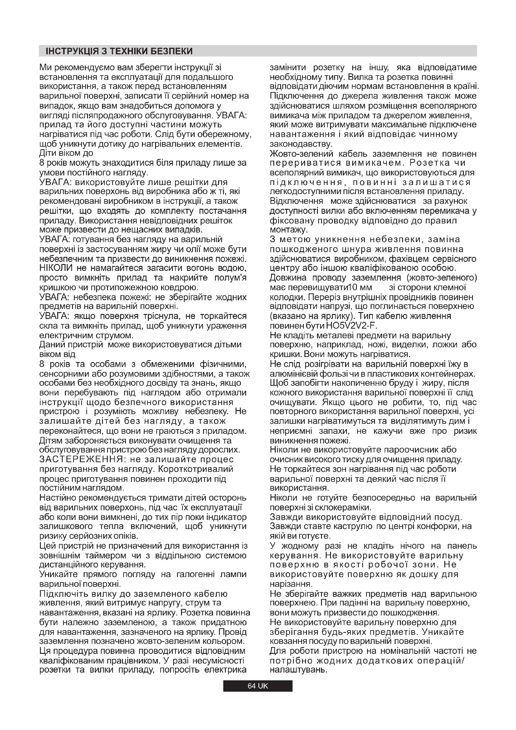 8 років та особами з обмеженими фізичними, сенсорними або розумовими здібностями, а також особами без необхідного досвіду та знань, якщо вони перебувають під наглядом або отримали інструкції щодо безпечного використання пристрою і розуміють можливу небезпеку. Не залишайте дітей без нагляду, а також переконайтеся, що вони не граються з приладом. Дітям забороняється виконувати очищення та обслуговування пристрою без нагляду дорослих. ЗАСТЕРЕЖЕННЯ: не залишайте процес приготування без нагляду. Короткотривалий процес приготування повинен проходити під постійним наглядом. Настійно рекомендується тримати дітей осторонь від варильних поверхонь, під час їх експлуатації або коли вони вимкнені, до тих пір поки індикатор залишкового тепла включений, щоб уникнути ризику серйозних опіків. Цей пристрій не призначений для використання із зовнішнім таймером чи з віддільною системою дистанційного керування. Уникайте прямого погляду на галогенні лампи варильної поверхні. Підключіть вилку до заземленого кабелю живлення, який витримує напругу, струм та навантаження, вказані на ярлику. Розетка повинна бути належно заземленою, а також придатною для навантаження, зазначеного на ярлику. Провід заземлення позначено жовто-зеленим кольором. Ця процедура повинна проводитися відповідним кваліфікованим працівником. У разі несумісності розетки та вилки приладу, попросіть електрика замінити розетку на іншу, яка відповідатиме необхідному типу. Вилка та розетка повинні відповідати діючим нормам встановлення в країні. Підключення до джерела живлення також може здійснюватися шляхом розміщення всеполярного вимикача між приладом та джерелом живлення, який може витримувати максимальне підключене навантаження і який відповідає чинному законодавству. Жовто-зелений кабель заземлення не повинен перериватися вимикачем. Розетка чи всеполярний вимикач, що використовуються для підключення, повинні залишатися легкодоступними після встановлення приладу. Відключення може здійснюватися за рахунок доступності вилки або включенням перемикача у фіксовану проводку відповідно до правил