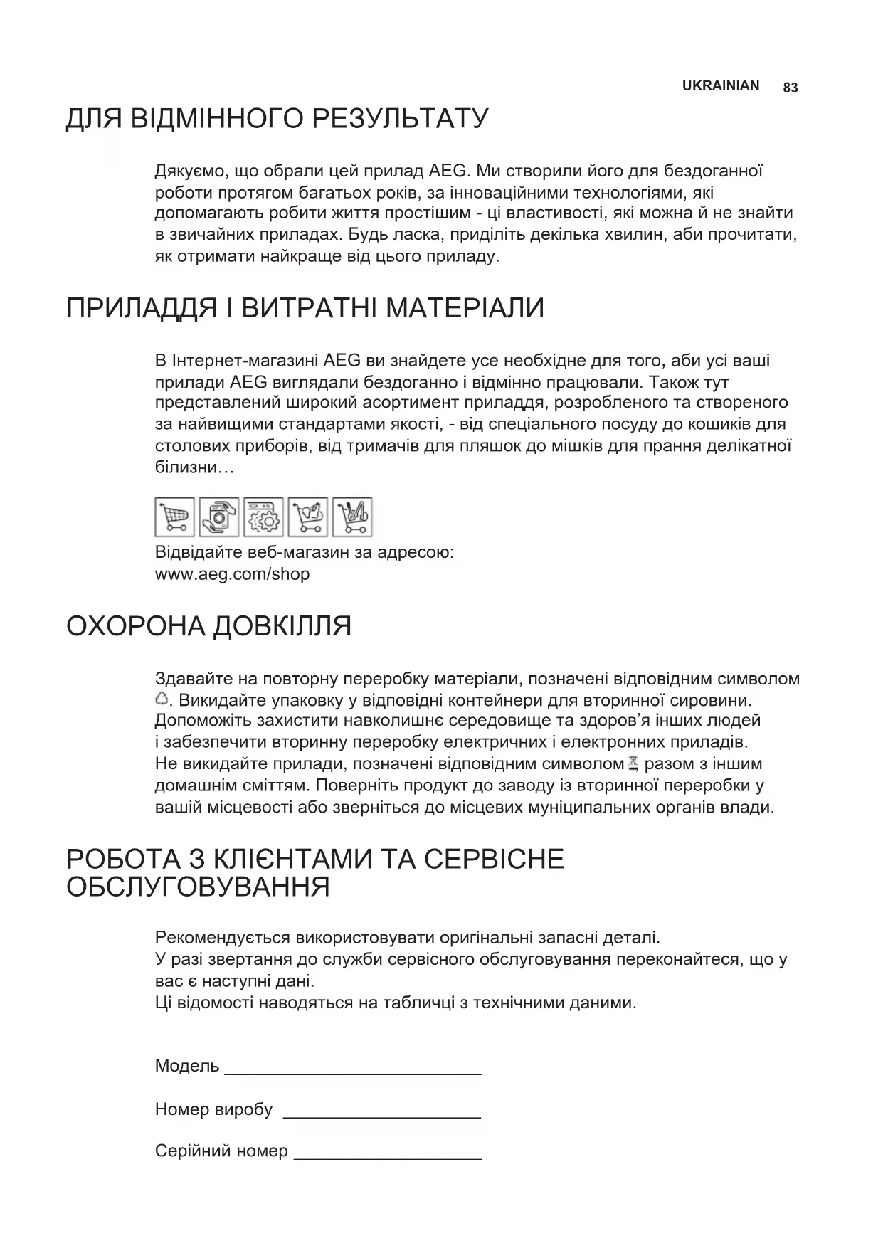 Відвідайте веб-магазин за адресою: www.aeg.com/shop ОХОРОНА ДОВКІЛЛЯ Здавайте на повторну переробку матеріали, позначені відповідним символом . Викидайте упаковку у відповідні контейнери для вторинної сировини. Допоможіть захистити навколишнє середовище та здоров’я інших людей і забезпечити вторинну переробку електричних і електронних приладів. Не викидайте прилади, позначені відповідним символом , разом з іншим домашнім сміттям. Поверніть продукт до заводу із вторинної переробки у вашій місцевості або зверніться до місцевих муніципальних органів влади. РОБОТА З КЛІЄНТАМИ ТА СЕРВІСНЕ ОБСЛУГОВУВАННЯ Рекомендується використовувати оригінальні запасні деталі. У разі звертання до служби сервісного обслуговування переконайтеся, що у вас є наступні дані. Ці відомості наводяться на табличці з технічними даними. Модель __________________________ Номер виробу ____________________ Серійний номер ___________________84 www.aeg.com