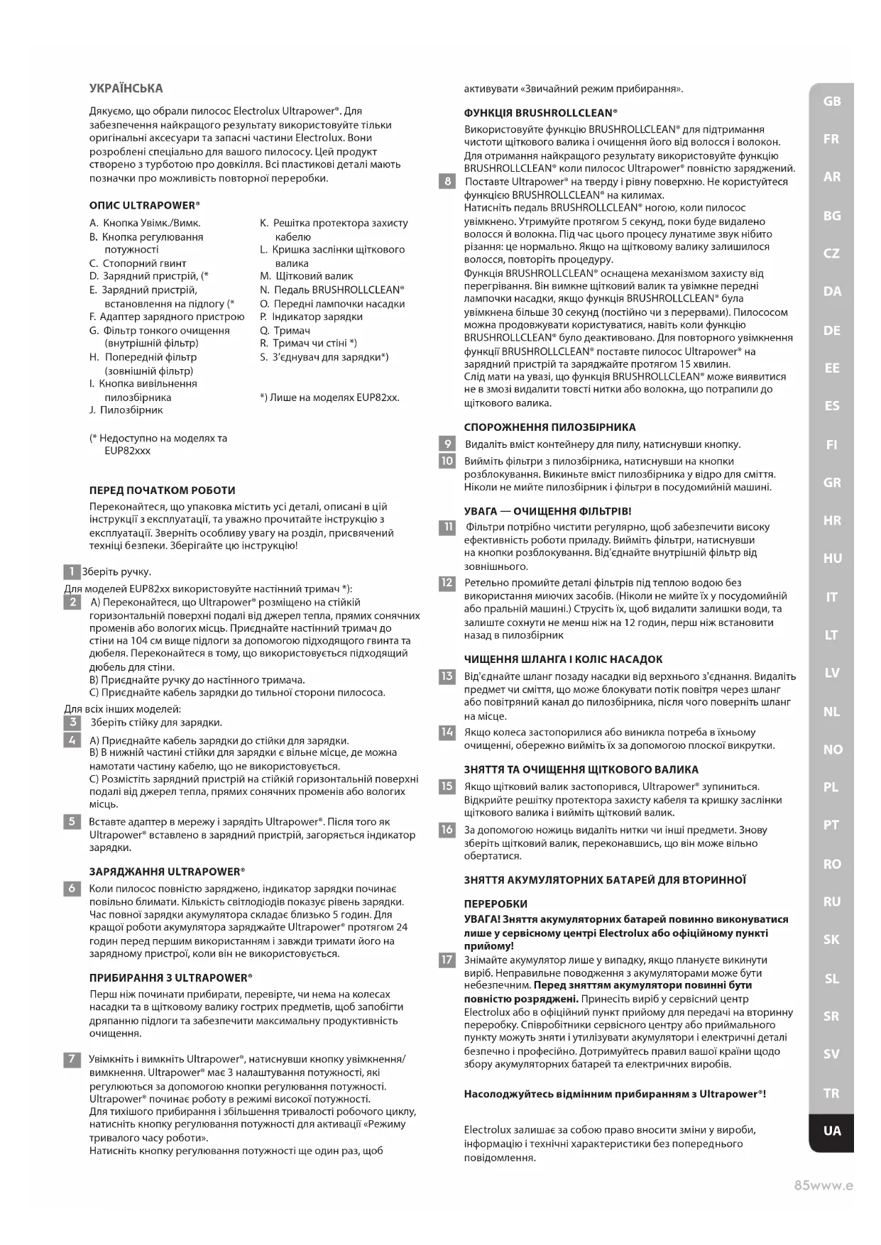 17 Знімайте акумулятор лише у випадку, якщо плануєте викинути виріб. Неправильне поводження з акумуляторами може бути небезпечним. Перед зняттям акумулятори повинні бути повністю розряджені. Принесіть виріб у сервісний центр Electrolux або в офіційний пункт прийому для передачі на вторинну переробку. Співробітники сервісного центру або приймального пункту можуть зняти і утилізувати акумулятори і електричні деталі безпечно і професійно. Дотримуйтесь правил вашої країни щодо збору акумуляторних батарей та електричних виробів. Насолоджуйтесь відмінним прибиранням з Ultrapower®!86www.electrolux.com