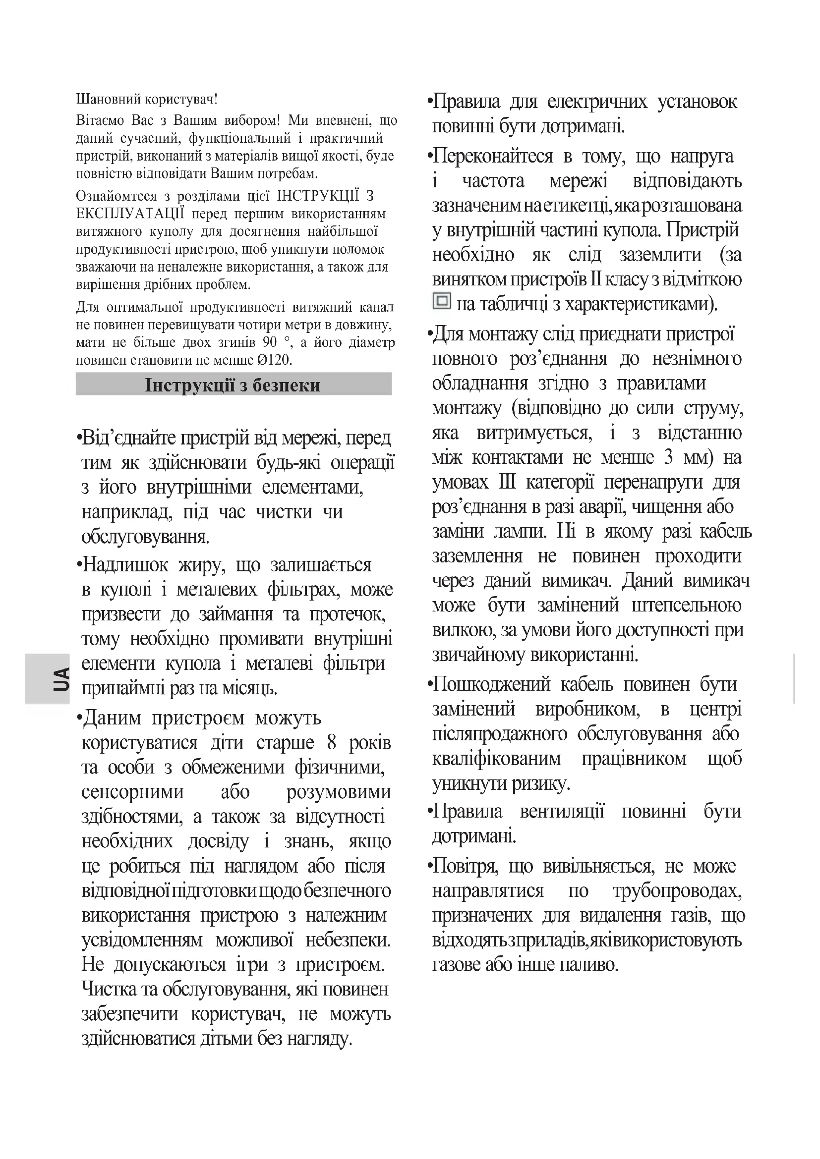 - Возможно, что при установке угольных фильтров в вытяжке может наблюдаться снижение расхода экстракции.UA Шановний користувач! Вітаємо Вас з Вашим вибором! Ми впевнені, що даний сучасний, функціональний і практичний пристрій, виконаний з матеріалів вищої якості, буде повністю відповідати Вашим потребам. Ознайомтеся з розділами цієї ІНСТРУКЦІЇ З ЕКСПЛУАТАЦІЇ перед першим використанням витяжного куполу для досягнення найбільшої продуктивності пристрою, щоб уникнути поломок зважаючи на неналежне використання, а також для вирішення дрібних проблем. Для оптимальної продуктивності витяжний канал не повинен перевищувати чотири метри в довжину, мати не більше двох згинів 90 °, а його діаметр повинен становити не менше Ø120.