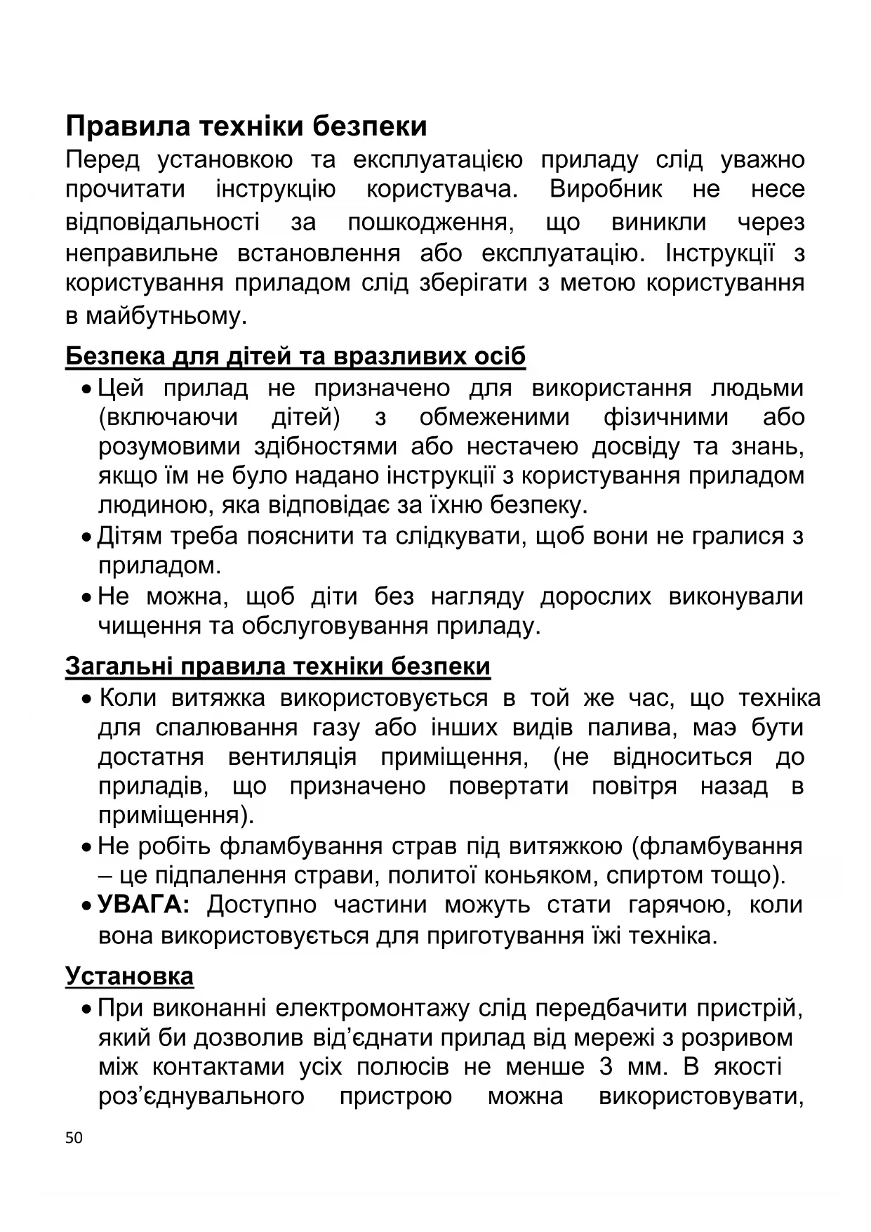 Не можна, щоб діти без нагляду дорослих виконували чищення та обслуговування приладу. Загальні правила техніки безпеки Коли витяжка використовується в той же час, що техніка для спалювання газу або інших видів палива, маэ бути достатня вентиляція приміщення, (не відноситься до приладів, що призначено повертати повітря назад в приміщення). Не робіть фламбування страв під витяжкою (фламбування – це підпалення страви, политої коньяком, спиртом тощо). УВАГА: Доступно частини можуть стати гарячою, коли вона використовується для приготування їжі техніка.
