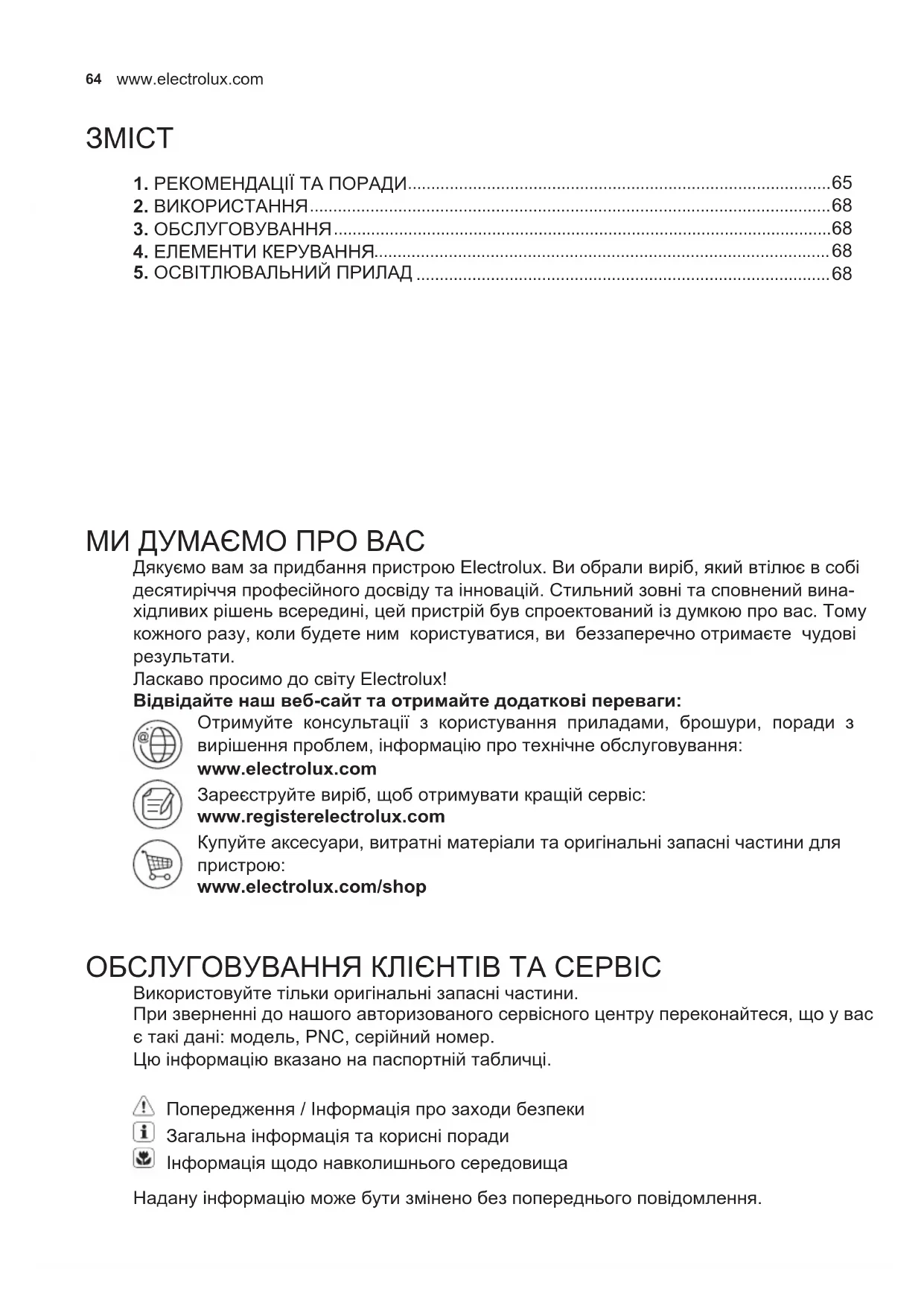 www.electrolux.com/shop ОБСЛУГОВУВАННЯ КЛІЄНТІВ ТА СЕРВІС Використовуйте тільки оригінальні запасні частини. При зверненні до нашого авторизованого сервісного центру переконайтеся, що у вас є такі дані: модель, PNC, серійний номер. Цю інформацію вказано на паспортній табличці. Попередження / Інформація про заходи безпеки Загальна інформація та корисні поради Інформація щодо навколишнього середовища Надану інформацію може бути змінено без попереднього повідомлення.65 UKRAINIAN