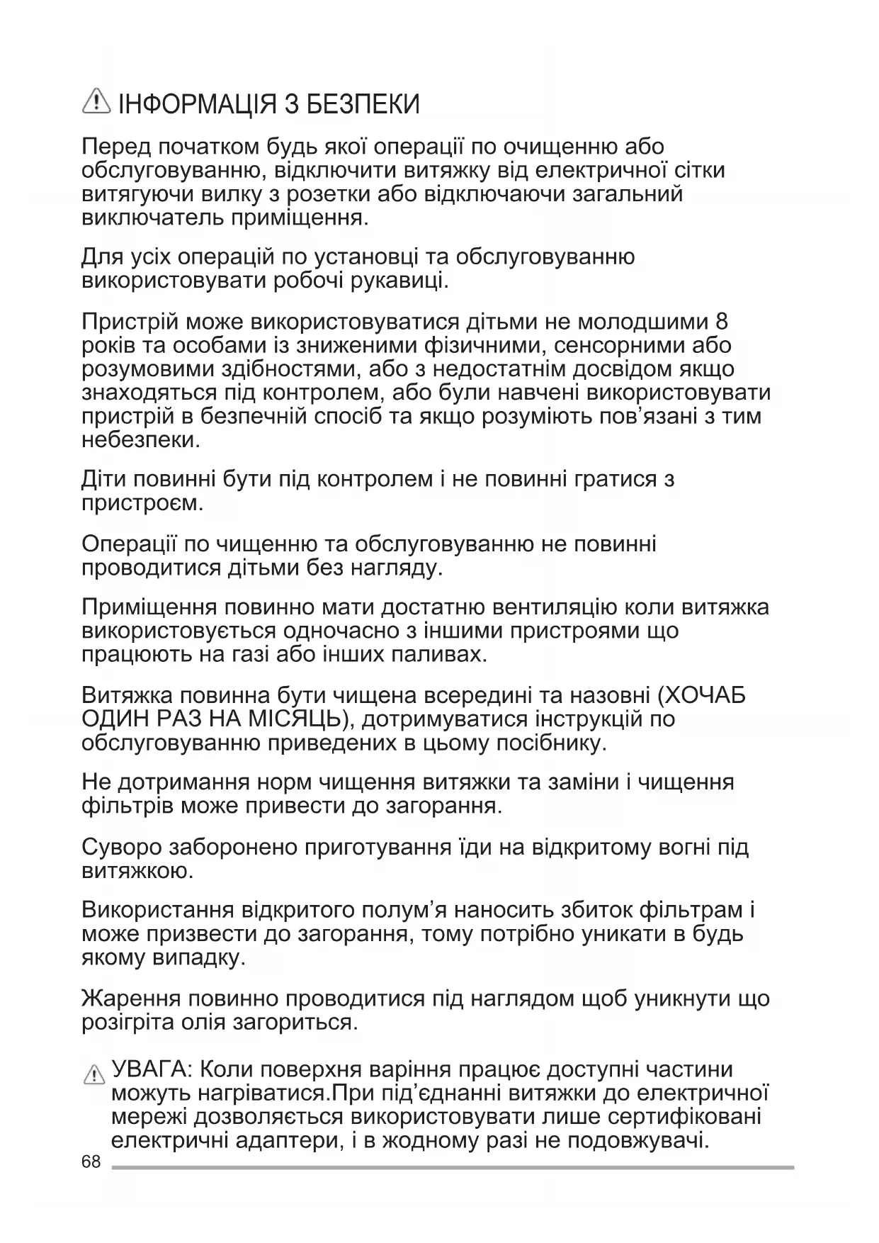 Операціїпочищеннютаобслуговуваннюнеповинні проводитисядітьмибезнагляду. Приміщенняповинноматидостатнювентиляціюколивитяжка використовуєтьсяодночаснозіншимипристроямищо працюютьнагазіабоіншихпаливах. Витяжкаповиннабутичищенавсерединітаназовні(ХОЧАБ ОДИНРАЗНАМІСЯЦЬ),дотримуватисяінструкційпо обслуговуваннюприведенихвцьомупосібнику. Недотриманнянормчищеннявитяжкитазаміниічищення фільтрівможепривестидозагорання. Суворозабороненоприготуванняїдинавідкритомувогніпід