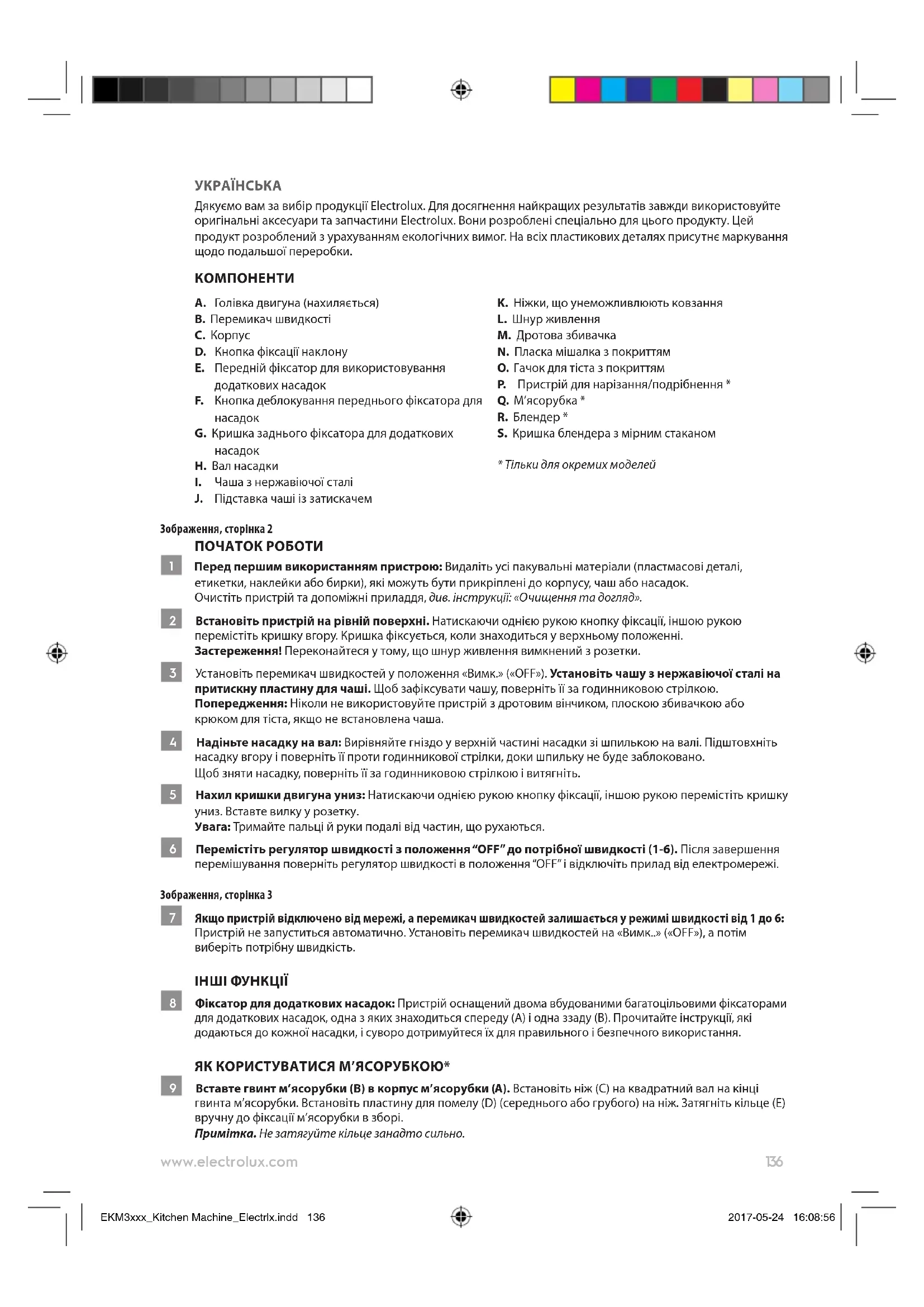 - Тільки для окремих моделей Зображення, сторінка 2 ПОЧАТОК РОБОТИ 1 Перед першим використанням пристрою: Видаліть усі пакувальні матеріали (пластмасові деталі, етикетки, наклейки або бирки), які можуть бути прикріплені до корпусу, чаш або насадок. Очистіть пристрій та допоміжні приладдя, див. інструкції: «Очищення та догляд». 2 Встановіть пристрій на рівній поверхні. Натискаючи однією рукою кнопку фіксації, іншою рукою перемістіть кришку вгору. Кришка фіксується, коли знаходиться у верхньому положенні. Застереження! Переконайтеся у тому, що шнур живлення вимкнений з розетки. 3 Установіть перемикач швидкостей у положення «Вимк.» («OFF»). Установіть чашу з нержавіючої сталі на притискну пластину для чаші. Щоб зафіксувати чашу, поверніть її за годинниковою стрілкою. Попередження: Ніколи не використовуйте пристрій з дротовим вінчиком, плоскою збивачкою або крюком для тіста, якщо не встановлена чаша. 4 Надіньте насадку на вал: Вирівняйте гніздо у верхній частині насадки зі шпилькою на валі. Підштовхніть насадку вгору і поверніть її проти годинникової стрілки, доки шпильку не буде заблоковано. Щоб зняти насадку, поверніть її за годинниковою стрілкою і витягніть. 5 Нахил кришки двигуна униз: Натискаючи однією рукою кнопку фіксації, іншою рукою перемістіть кришку униз. Вставте вилку у розетку. Увага: Тримайте пальці й руки подалі від частин, що рухаються. 6 Перемістіть регулятор швидкості з положення “OFF” до потрібної швидкості (1-6). Після завершення перемішування поверніть регулятор швидкості в положення “OFF” і відключіть прилад від електромережі. Зображення, сторінка 3 7 Якщо пристрій відключено від мережі, а перемикач швидкостей залишається у режимі швидкості від 1 до 6: Пристрій не запуститься автоматично. Установіть перемикач швидкостей на «Вимк..» («OFF»), а потім виберіть потрібну швидкість. ІНШІ ФУНКЦІЇ 8 Фіксатор для додаткових насадок: Пристрій оснащений двома вбудованими багатоцільовими фіксаторами для додаткових насадок, одна з яких знаходиться спереду (A) і одна ззаду (B). Прочитайте інструкції, які додаються до кожної насадки, і суворо дотримуйтеся їх для правильного і безпечного використання. ЯК КОРИСТУВАТИСЯ М’ЯСОРУБКОЮ* 9 Вставте гвинт м’ясорубки (B) в корпус м’ясорубки (A). Встановіть ніж (C) на квадратний вал на кінці гвинта м’ясорубки. Встановіть пластину для помелу (D) (середнього або грубого) на ніж. Затягніть кільце (E) вручну до фіксації м’ясорубки в зборі. Примітка. Не затягуйте кільце занадто сильно. EKM3xxx_Kitchen Machine_Electrlx.indd 136 2017-05-24 16:08:56137 www.electrolux.com