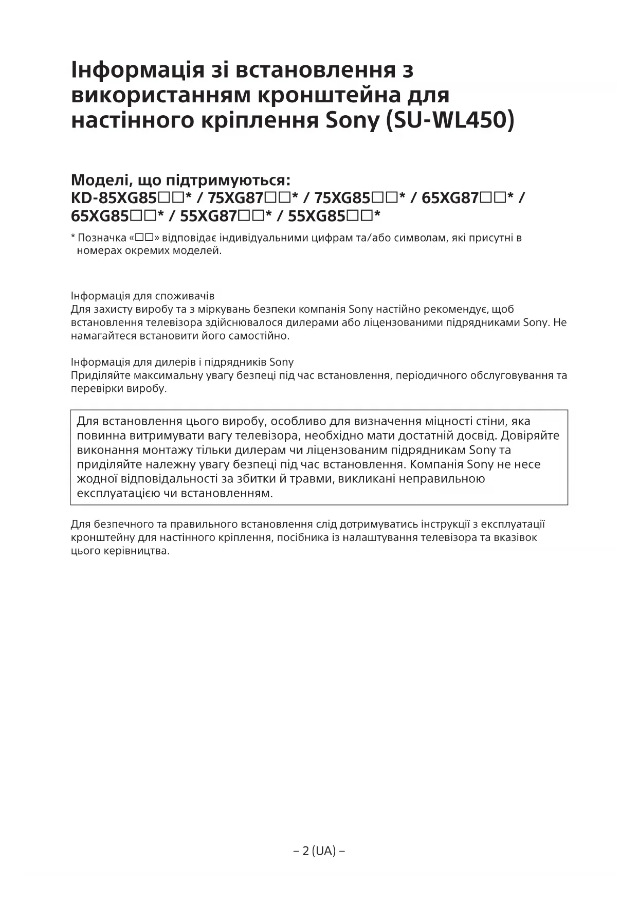 - Позначка «» відповідає індивідуальними цифрам та/або символам, які присутні в номерах окремих моделей. Інформація для споживачів Для захисту виробу та з міркувань безпеки компанія Sony настійно рекомендує, щоб встановлення телевізора здійснювалося дилерами або ліцензованими підрядниками Sony. Не намагайтеся встановити його самостійно. Інформація для дилерів і підрядників Sony Приділяйте максимальну увагу безпеці під час встановлення, періодичного обслуговування та перевірки виробу. Для встановлення цього виробу, особливо для визначення міцності стіни, яка повинна витримувати вагу телевізора, необхідно мати достатній досвід. Довіряйте виконання монтажу тільки дилерам чи ліцензованим підрядникам Sony та приділяйте належну увагу безпеці під час встановлення. Компанія Sony не несе жодної відповідальності за збитки й травми, викликані неправильною експлуатацією чи встановленням. Для безпечного та правильного встановлення слід дотримуватись інструкції з експлуатації кронштейну для настінного кріплення, посібника із налаштування телевізора та вказівок цього керівництва.− 3 (UA) −