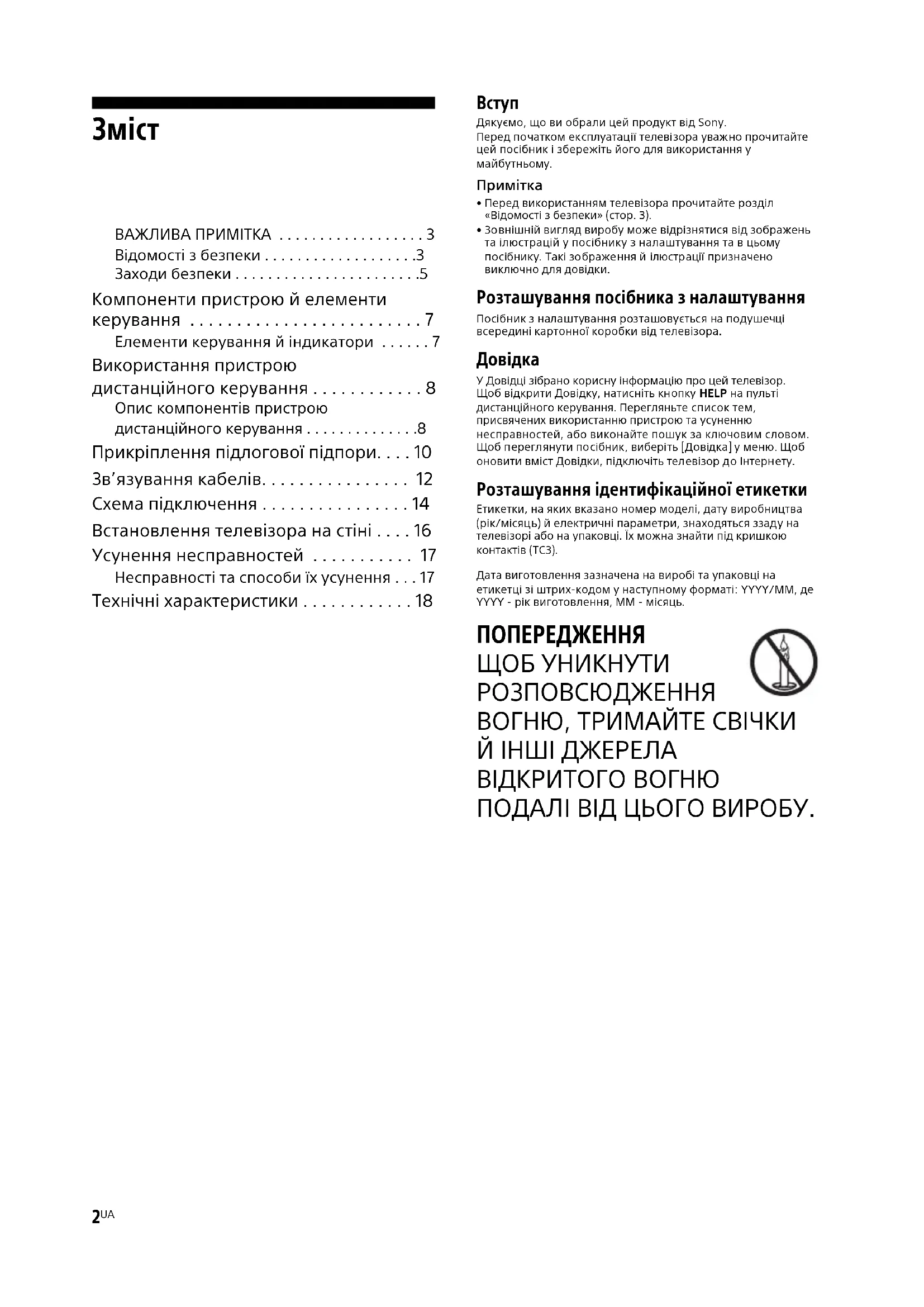 - Зовнішній вигляд виробу може відрізнятися від зображень та ілюстрацій у посібнику з налаштування та в цьому посібнику. Такі зображення й ілюстрації призначено виключно для довідки. Розташування посібника з налаштування Посібник з налаштування розташовується на подушечці всередині картонної коробки від телевізора. У Довідці зібрано корисну інформацію про цей телевізор. Щоб відкрити Довідку, натисніть кнопку HELP на пульті дистанційного керування. Перегляньте список тем, присвячених використанню пристрою та усуненню несправностей, або виконайте пошук за ключовим словом. Щоб переглянути посібник, виберіть [Довідка] у меню. Щоб оновити вміст Довідки, підключіть телевізор до Інтернету. Розташування ідентифікаційної етикетки Етикетки, на яких вказано номер моделі, дату виробництва (рік/місяць) й електричні параметри, знаходяться ззаду на телевізорі або на упаковці. Їх можна знайти під кришкою контактів (TC3).Дата виготовлення зазначена на виробі та упаковці на етикетці зі штрих-кодом у наступному форматі: YYYY/MM, де YYYY - рік виготовлення, MM - місяць. ПОПЕРЕДЖЕННЯ ЩОБ УНИКНУТИ РОЗПОВСЮДЖЕННЯ ВОГНЮ, ТРИМАЙТЕ СВІЧКИ Й ІНШІ ДЖЕРЕЛА ВІДКРИТОГО ВОГНЮ ПОДАЛІ ВІД ЦЬОГО ВИРОБУ.3
