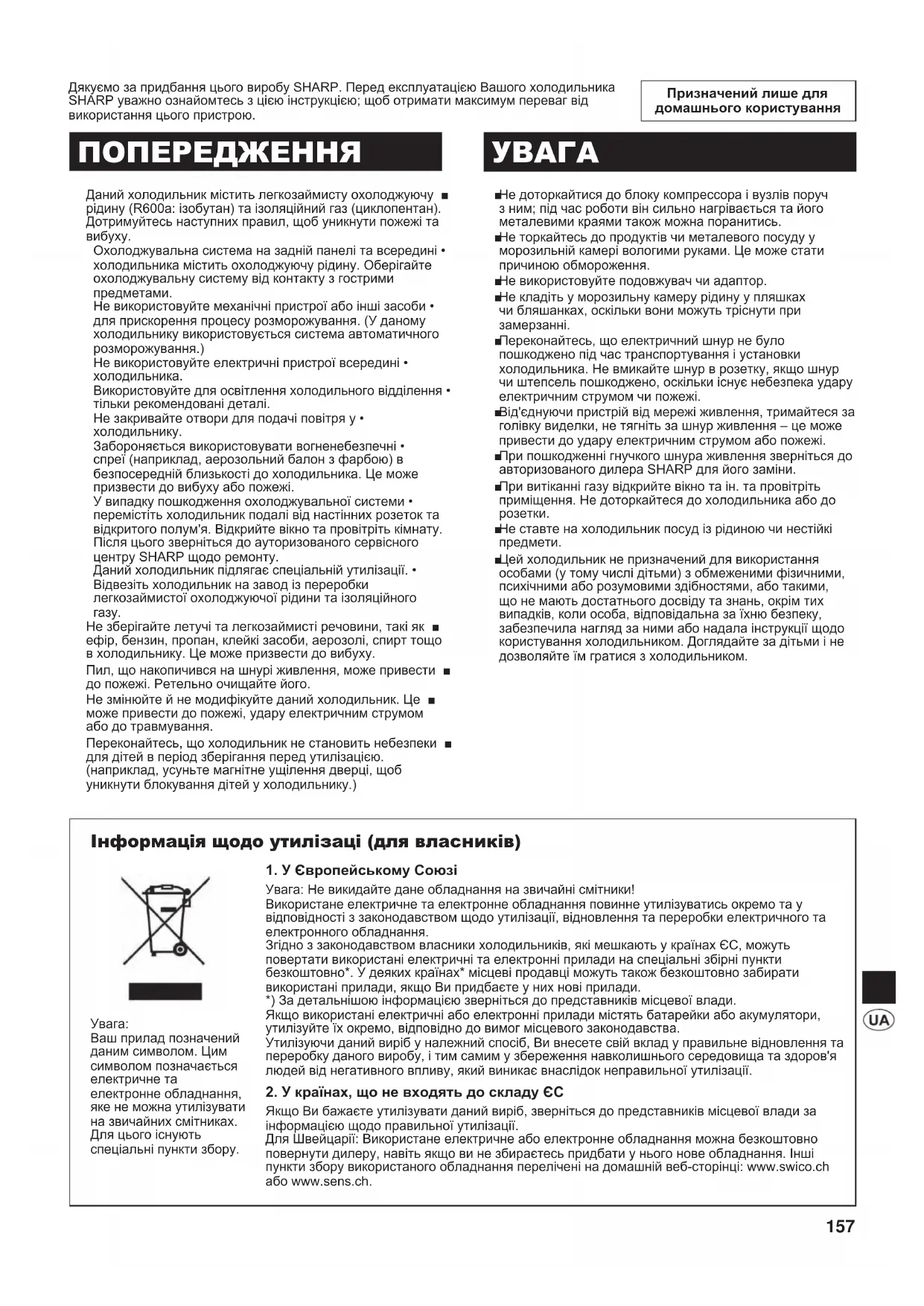 Цей холодильник не призначений для використання ■ особами (у тому числі дітьми) з обмеженими фізичними, психічними або розумовими здібностями, або такими, що не мають достатнього досвіду та знань, окрім тих випадків, коли особа, відповідальна за їхню безпеку, забезпечила нагляд за ними або надала інструкції щодо користування холодильником. Доглядайте за дітьми і не дозволяйте їм гратися з холодильником. Інформація щодо утилізаці (для власників)