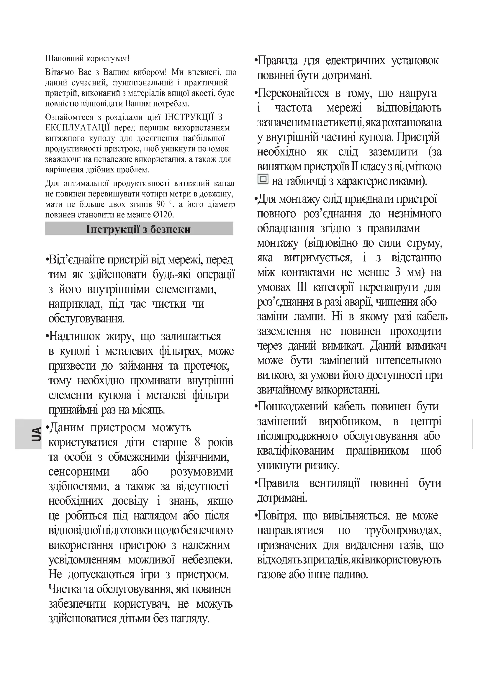 - Витяжний купол призначений для побутового використання і виключно для уловлювання та очищення повітря від продуктів приготування їжі. Користувач несе відповідальність за використання куполу для іншого призначення, що може представляти загрозу для користувача. Виробник не несе відповідальності за збиток, отриманий при неналежному використанні пристрою.