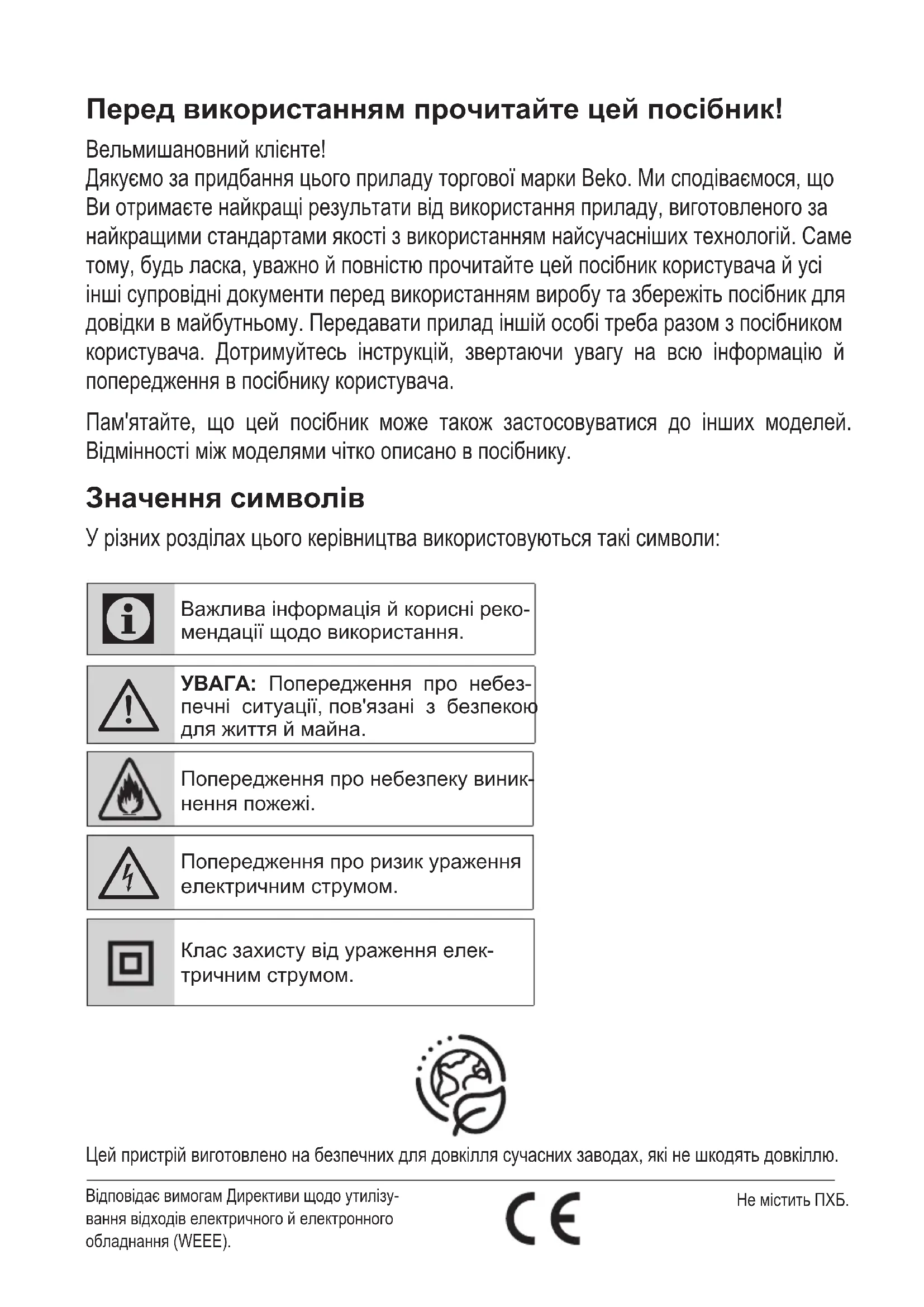 - aplikujte u digestorov s dotykovým ovládaním. Ak vyššie uvedené odporúčania nevyriešia problém, obráťte sa na autorizovanú službu pre domáce spotrebiče oprávnenú na opravu. Za žiadnych okolností nie je užívateľ digestora oprávnený na nezávislú opravu. Zoznam servisných miest je súčasťou záručnej karty a webovej stránky.Перед використанням прочитайте цей посібник! Вельмишановний клієнте! Дякуємо за придбання цього приладу торгової марки Beko. Ми сподіваємося, що Ви отримаєте найкращі результати від використання приладу, виготовленого за найкращими стандартами якості з використанням найсучасніших технологій. Саме тому, будь ласка, уважно й повністю прочитайте цей посібник користувача й усі інші супровідні документи перед використанням виробу та збережіть посібник для довідки в майбутньому. Передавати прилад іншій особі треба разом з посібником користувача. Дотримуйтесь інструкцій, звертаючи увагу на всю інформацію й попередження в посібнику користувача. Пам'ятайте, що цей посібник може також застосовуватися до інших моделей. Відмінності між моделями чітко описано в посібнику. Значення символів У різних розділах цього керівництва використовуються такі символи: