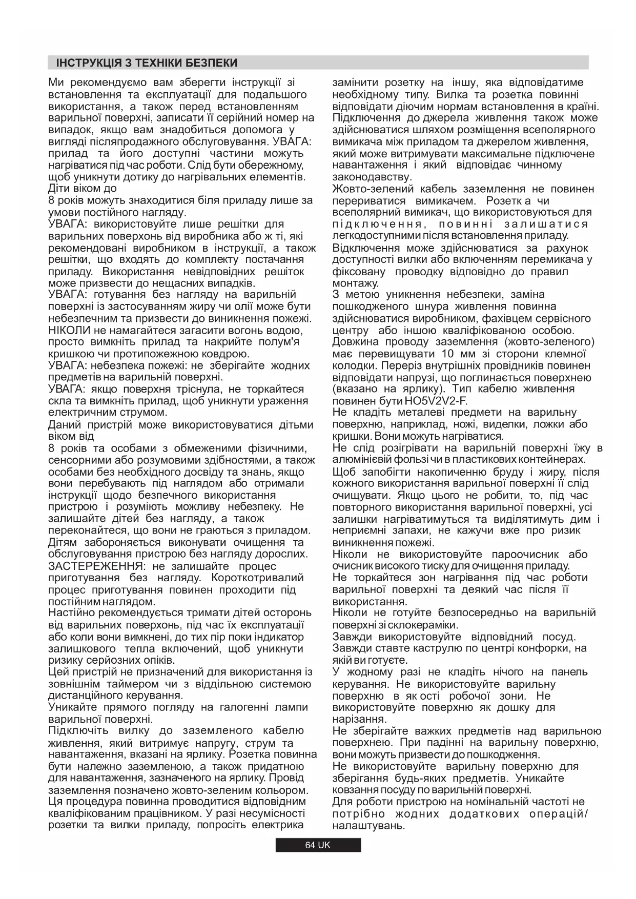 8 років та особами з обмеженими фізичними, сенсорними або розумовими здібностями, а також особами без необхідного досвіду та знань, якщо вони перебувають під наглядом або отримали інструкції щодо безпечного використання пристрою і розуміють можливу небезпеку. Не залишайте дітей без нагляду, а також переконайтеся, що вони не граються з приладом. Дітям забороняється виконувати очищення та обслуговування пристрою без нагляду дорослих. Уникайте прямого погляду на галогенні лампи варильної поверхні. УВАГА: якщо поверхня тріснула, не торкайтеся скла та вимкніть прилад, щоб уникнути ураження електричним струмом. Підключіть вилку до заземленого кабелю живлення, який витримує напругу, струм та навантаження, вказані на ярлику. Розетка повинна бути належно заземленою, а також придатною для навантаження, зазначеного на ярлику. Провід заземлення позначено жовто-зеленим кольором. Ця процедура повинна проводитися відповідним кваліфікованим працівником. У разі несумісності розетки та вилки приладу, попросіть електрика ЗАСТЕРЕЖЕННЯ: не залишайте процес приготування без нагляду. Короткотривалий процес приготування повинен проходити під постійним наглядом. УВАГА: небезпека пожежі: не зберігайте жодних предметів на варильній поверхні. Відключення може здійснюватися за рахунок доступності вилки або включенням перемикача у фіксовану проводку відповідно до правил