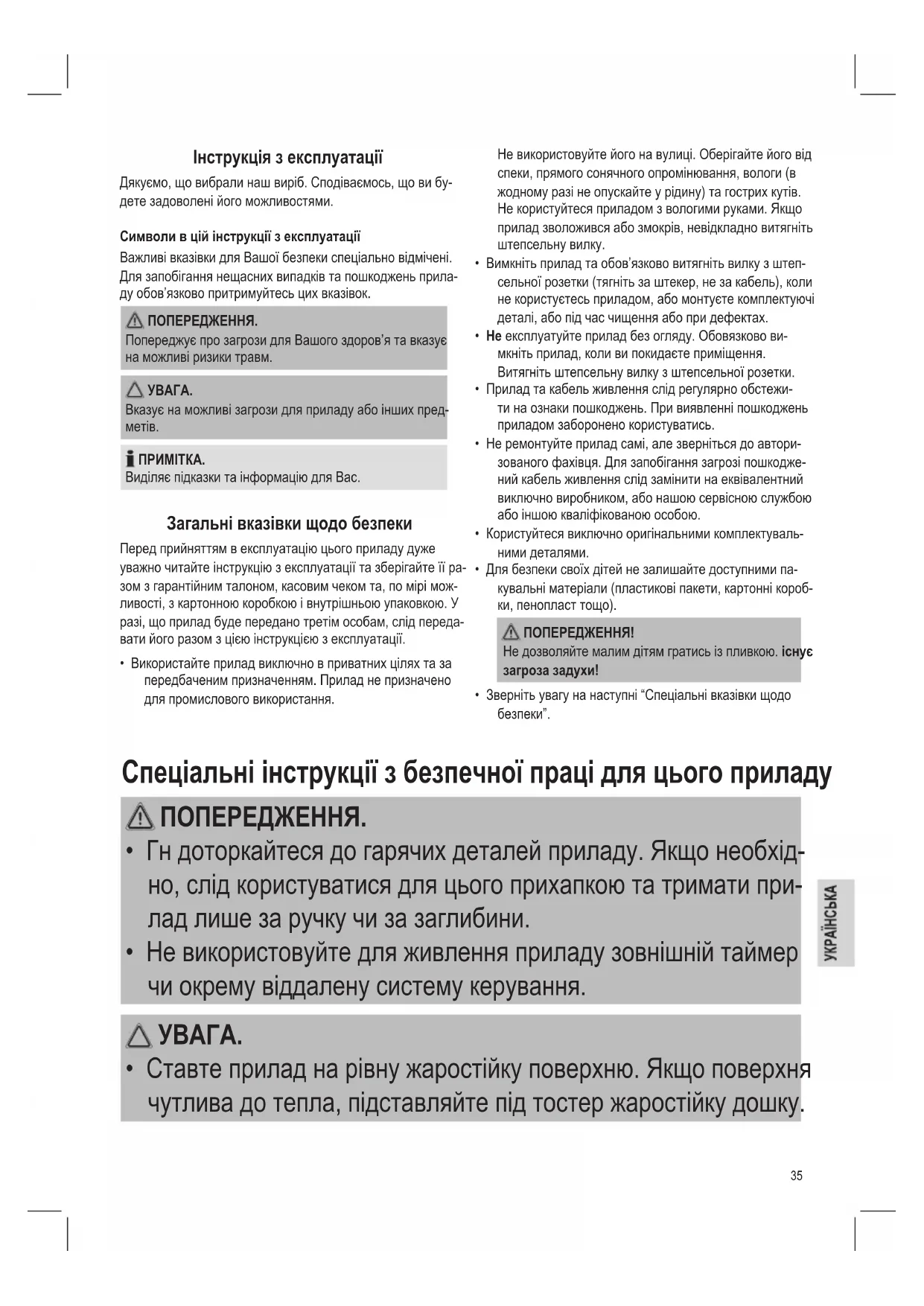 Виділяє підказки та інформацію для Вас. Загальні вказівки щодо безпеки Перед прийняттям в експлуатацію цього приладу дуже уважно читайте інструкцію з експлуатації та зберігайте її ра- зом з гарантійним талоном, касовим чеком та, по мірі мож- ливості, з картонною коробкою і внутрішньою упаковкою. У разі, що прилад буде передано третім особам, слід переда- вати його разом з цією інструкцією з експлуатації.