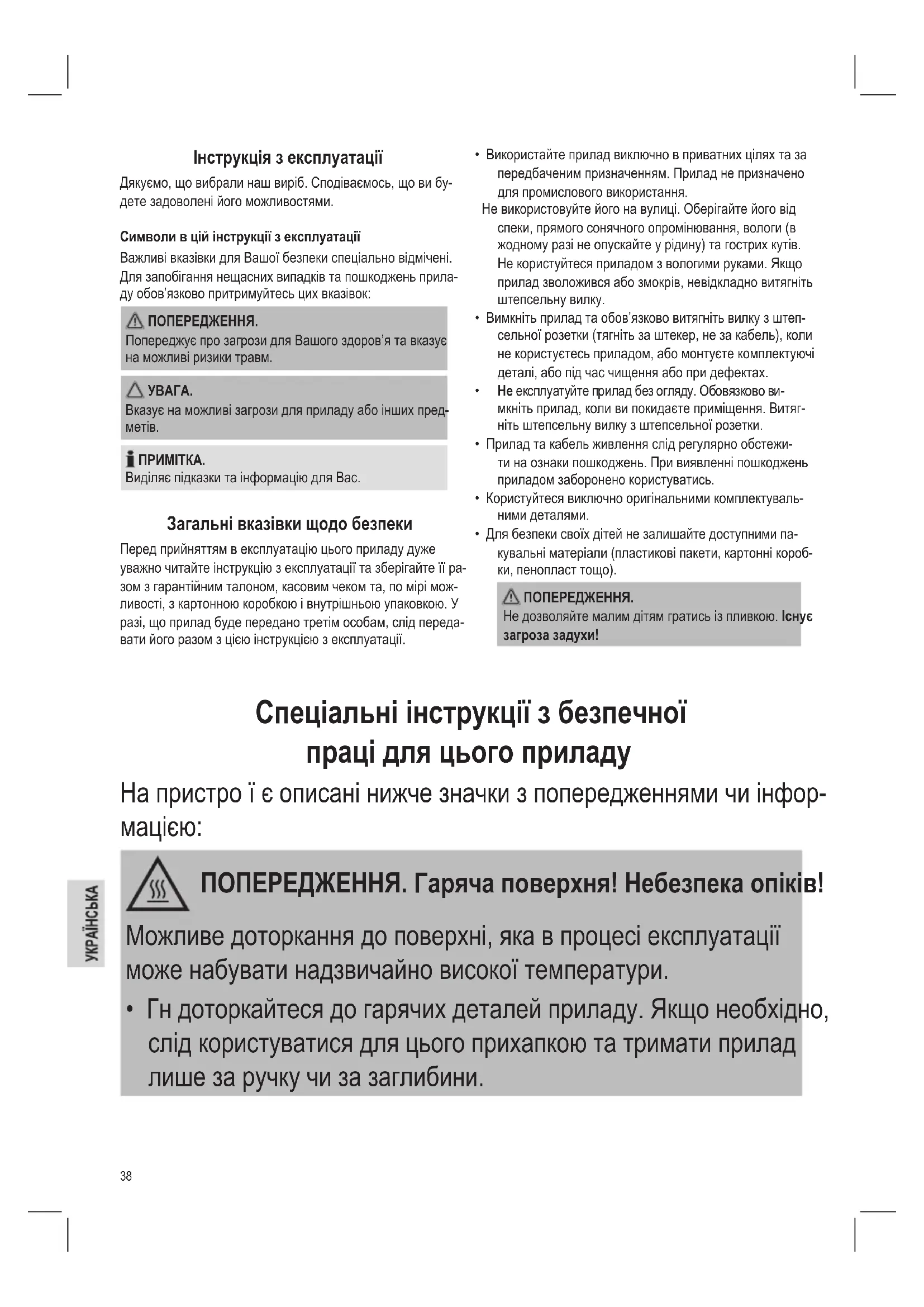 - Гн доторкайтеся до гарячих деталей приладу. Якщо необхідно, слід користуватися для цього прихапкою та тримати прилад лише за ручку чи за заглибини.39 ПОПЕРЕДЖЕННЯ.