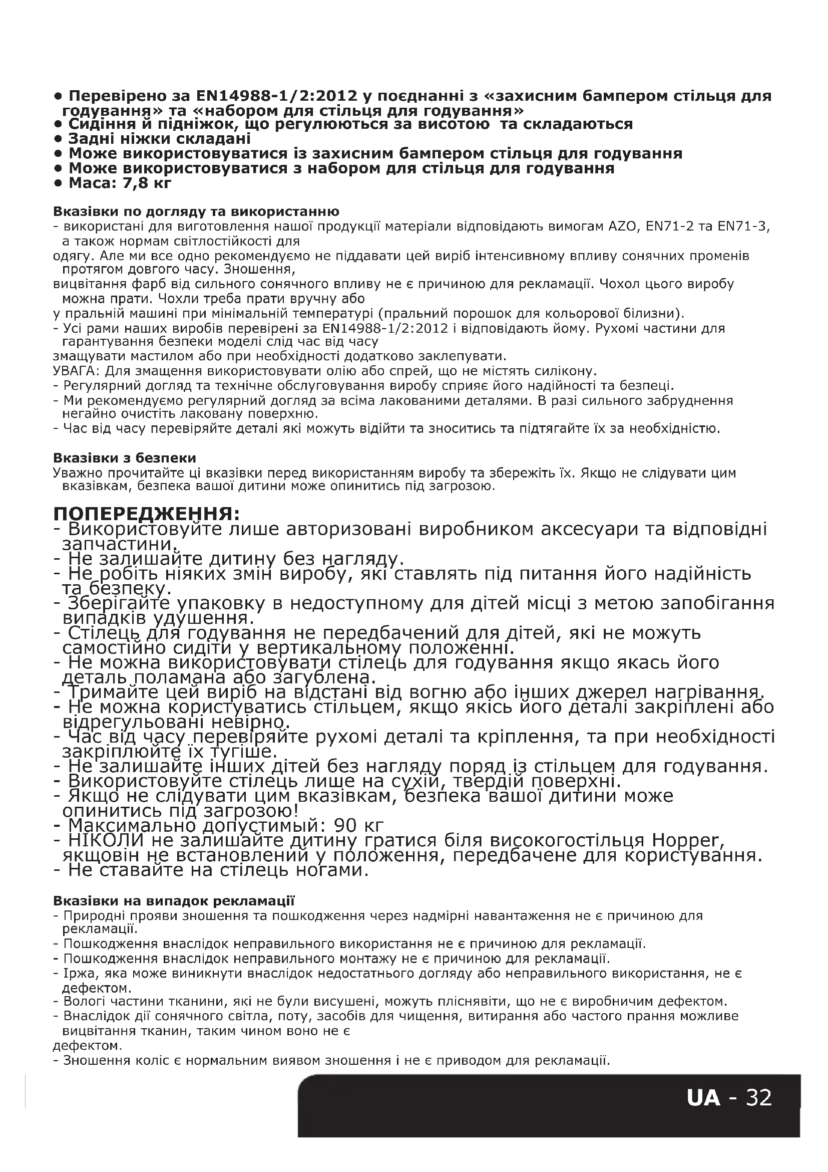 - Маса: 7,8 кг Вказівки по догляду та використанню - використані для виготовлення нашої продукції матеріали відповідають вимогам AZO, EN71-2 та EN71-3, а також нормам світлостійкості для одягу. Але ми все одно рекомендуємо не піддавати цей виріб інтенсивному впливу сонячних променів протягом довгого часу. Зношення, вицвітання фарб від сильного сонячного впливу не є причиною для рекламації. Чохол цього виробу можна прати. Чохли треба прати вручну або у пральній машині при мінімальній температурі (пральний порошок для кольорової білизни). - Усі рами наших виробів перевірені за EN14988-1/2:2012 і відповідають йому. Рухомі частини для гарантування безпеки моделі слід час від часу змащувати мастилом або при необхідності додатково заклепувати. УВАГА: Для змащення використовувати олію або спрей, що не містять силікону. - Регулярний догляд та технічне обслуговування виробу сприяє його надійності та безпеці. - Ми рекомендуємо регулярний догляд за всіма лакованими деталями. В разі сильного забруднення негайно очистіть лаковану поверхню. - Час від часу перевіряйте деталі які можуть відійти та зноситись та підтягайте їх за необхідністю. Вказівки з безпеки Уважно прочитайте ці вказівки перед використанням виробу та збережіть їх. Якщо не слідувати цим вказівкам, безпека вашої дитини може опинитись під загрозою. ПОПЕРЕДЖЕННЯ: - Використовуйте лише авторизовані виробником аксесуари та відповідні запчастини. - Не залишайте дитину без нагляду. - Не робіть ніяких змін виробу, які ставлять під питання його надійність та безпеку. - Зберігайте упаковку в недоступному для дітей місці з метою запобігання випадків удушення. - Стілець для годування не передбачений для дітей, які не можуть самостійно сидіти у вертикальному положенні. - Не можна використовувати стілець для годування якщо якась його деталь поламана або загублена. - Тримайте цей виріб на відстані від вогню або інших джерел нагрівання. - Не можна користуватись стільцем, якщо якісь його деталі закріплені або відрегульовані невірно. - Час від часу перевіряйте рухомі деталі та кріплення, та при необхідності закріплюйте їх тугіше. - Не залишайте інших дітей без нагляду поряд із стільцем для годування. - Використовуйте стілець лише на сухій, твердій поверхні. - Якщо не слідувати цим вказівкам, безпека вашої дитини може опинитись під загрозою! - Максимально допустимый: 90 кг - НІКОЛИ не залишайте дитину гратися біля високогостільця Hopper, якщовін не встановлений у положення, передбачене для користування. - Не ставайте на стілець ногами. Вказівки на випадок рекламації - Природні прояви зношення та пошкодження через надмірні навантаження не є причиною для рекламації. - Пошкодження внаслідок неправильного використання не є причиною для рекламації. - Пошкодження внаслідок неправильного монтажу не є причиною для рекламації. - Іржа, яка може виникнути внаслідок недостатнього догляду або неправильного використання, не є