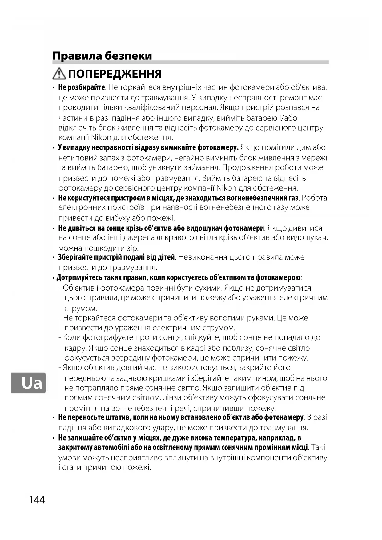 - Не розбирайте. Не торкайтеся внутрішніх частин фотокамери або об’єктива, це може призвести до травмування. У випадку несправності ремонт має проводити тільки кваліфікований персонал. Якщо пристрій розпався на частини в разі падіння або іншого випадку, вийміть батарею і/або відключіть блок живлення та віднесіть фотокамеру до сервісного центру компанії Nikon для обстеження.