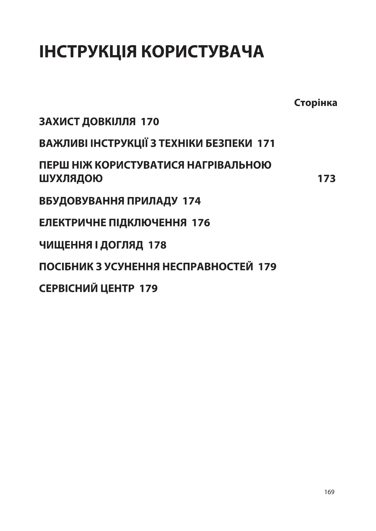 ЗАХИСТ ДОВКІЛЛЯ 170 ВАЖЛИВІ ІНСТРУКЦІЇ З ТЕХНІКИ БЕЗПЕКИ 171 ПЕРШ НІЖ КОРИСТУВАТИСЯ НАГРІВАЛЬНОЮ ШУХЛЯДОЮ 173 ВБУДОВУВАННЯ ПРИЛАДУ 174 ЕЛЕКТРИЧНЕ ПІДКЛЮЧЕННЯ 176 ЧИЩЕННЯ І ДОГЛЯД 178 ПОСІБНИК З УСУНЕННЯ НЕСПРАВНОСТЕЙ 179 СЕРВІСНИЙ ЦЕНТР 179170 ЗАХИСТ ДОВКІЛЛЯ Утилізація упаковки