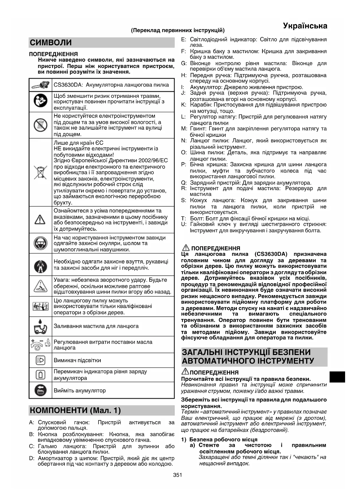 S: Кожух ланцюга: Кожух для закривання шини пилки та ланцюга пилки, коли пристрій не використовується. T: Болт: Болт для фіксації бічної кришки на місці. U: Гайковий ключ у вигляді шестигранного стрижня: Інструмент для викручування і закручування болта. ПОПЕРЕДЖЕННЯ Ця ланцюгова пилка (CS3630DA) призначена головним чином для догляду за деревами та обрізки дерев. Цю пилку можуть використовувати тільки кваліфіковані оператори з догляду та обрізки дерев. Дотримуйтесь вказівок усіх посібників, процедур та рекомендацій відповідної професійної організації. Їх невиконання буде означати високий ризик нещасного випадку. Рекомендується завжди використовувати підйомну платформу для роботи з деревами. Методи спуску на канаті є надзвичайно небезпечними та вимагають спеціального тренування. Оператор повинен бути тренованим та обізнаним з використанням захисних засобів та методами підйому. Завжди використовуйте фіксуюче обладнання для оператора та пилки. ЗАГАЛЬНІ ІНСТРУКЦІЇ БЕЗПЕКИ АВТОМАТИЧНОГО ІНСТРУМЕНТУ ПОПЕРЕДЖЕННЯ Прочитайте всі інструкції та правила безпеки. Невиконання правил та інструкції може спричинити ураження струмом, пожежу і/або важкі травми. Збережіть всі інструкції та правила для подальшого користування. Термін «автоматичний інструмент» у правилах позначає Ваш електричний, що працює від мережі (з дротом), автоматичний інструмент або електричний інструмент, що працює на батарейках (бездротовий).