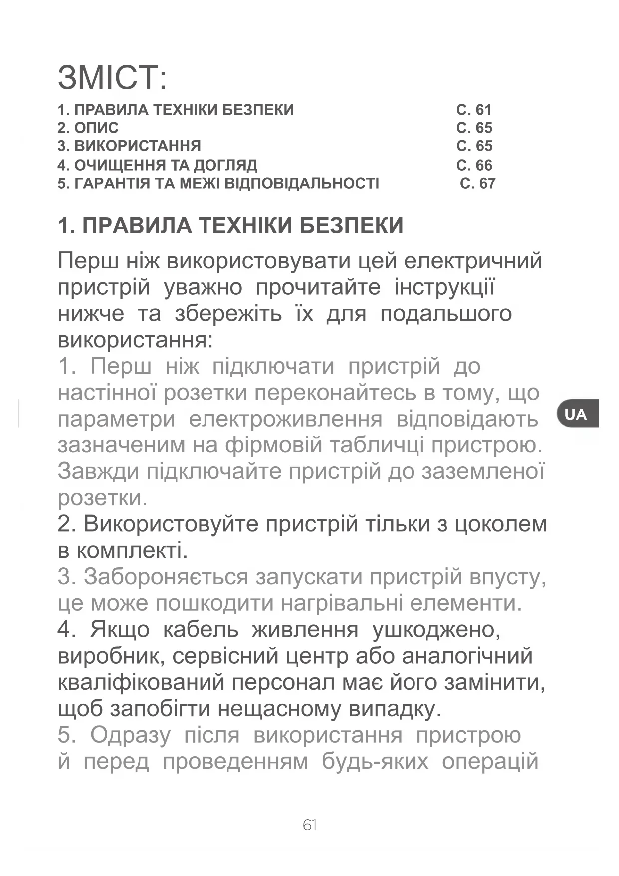 RU1. ПРАВИЛА ТЕХНІКИ БЕЗПЕКИ Перш ніж використовувати цей електричний пристрій уважно прочитайте інструкції нижче та збережіть їх для подальшого використання: