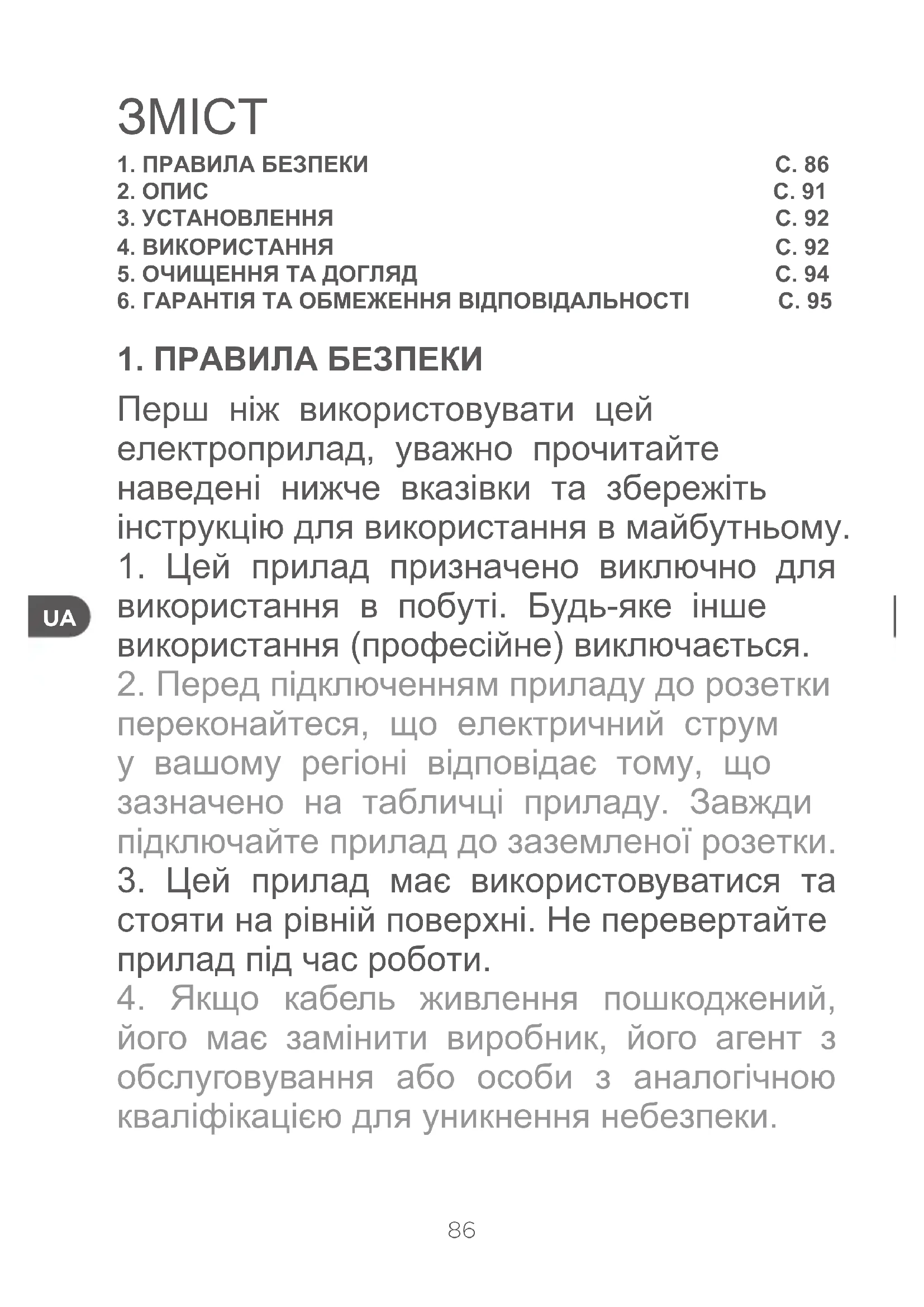 RU1. ПРАВИЛА БЕЗПЕКИ Перш ніж використовувати цей електроприлад, уважно прочитайте наведені нижче вказівки та збережіть інструкцію для використання в майбутньому.