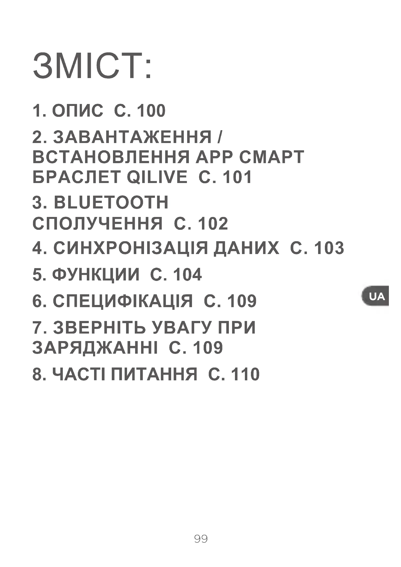 при заряджанні Qilive Smartband використовує магнітний пого- контактний кабель зарядки, як магніт з анодом і катодом, будь ласка, заряджайте відповідно до напрямку магніта. (Правильний спосіб заряджання, коли ви кладете кабель близько до годинника, годинник автоматично його затягує. Інакше ви відчуєте, як годинник відштовхує кабель). В іншому випадку це викличе коротке замикання. Таке пошкодження не покривається гарантією.110