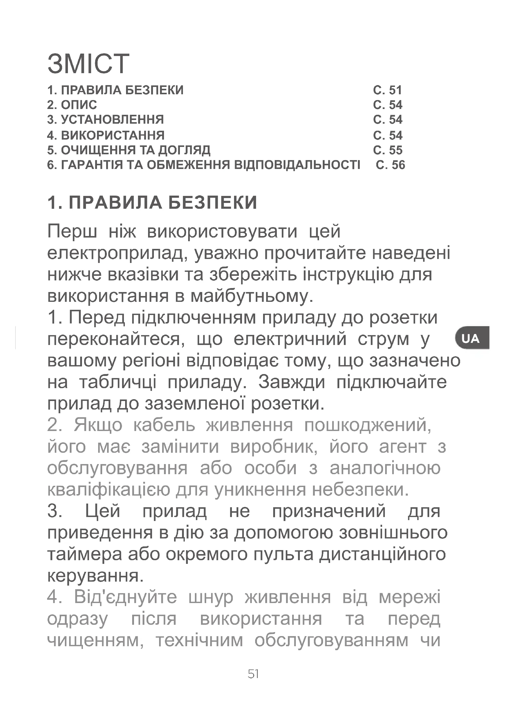 RU1. ПРАВИЛА БЕЗПЕКИ Перш ніж використовувати цей електроприлад, уважно прочитайте наведені нижче вказівки та збережіть інструкцію для використання в майбутньому.