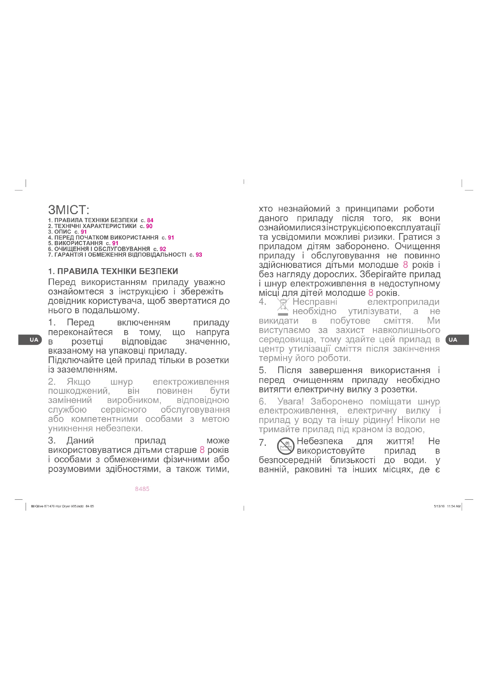 Небезпека для життя! Не використовуйте прилад в безпосередній близькості до води. у ванній, раковині та інших місцях, де є IM-Qilive-871470-Hair Dryer-V05.indd 84-85 5/13/16 11:54 AM86 87 вода. Коли прилад вимкнений, а шнур електроживлення підключений в розетку, не тримайте прилад близько до води або іншої рідини.