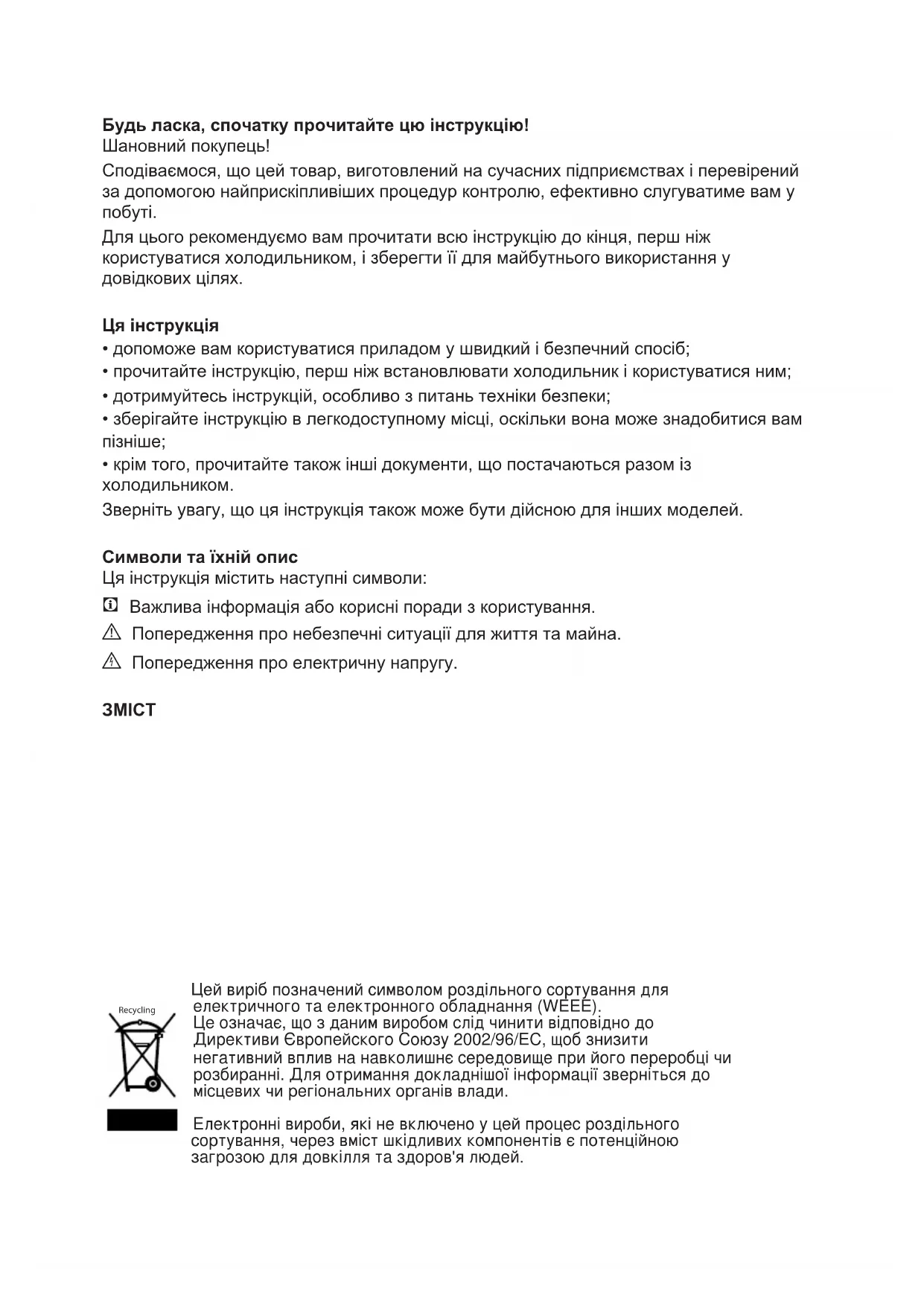 Для цього рекомендуємо вам прочитати всю інструкцію до кінця, перш ніж користуватися холодильником, і зберегти її для майбутнього використання у довідкових цілях. Ця інструкція