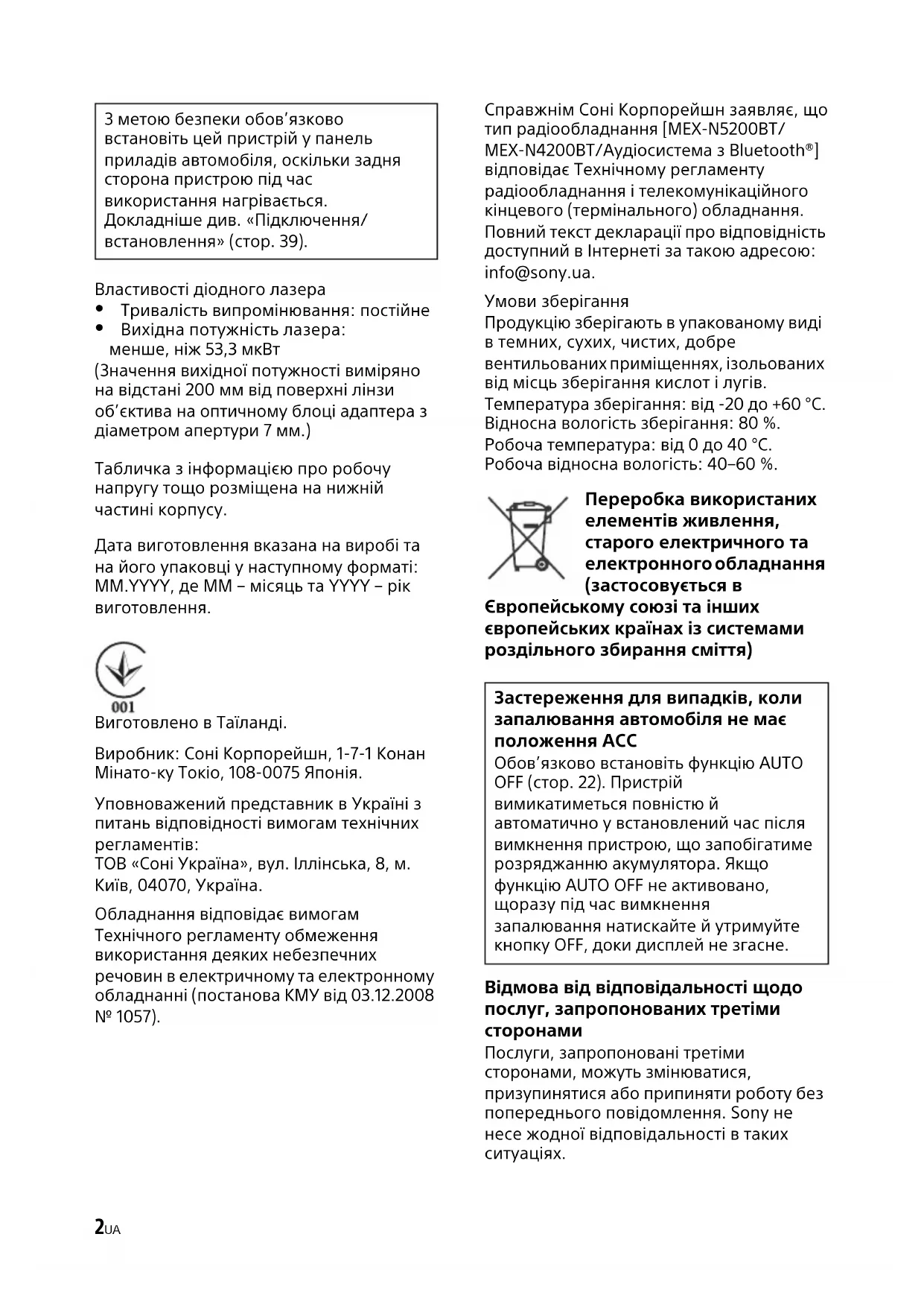 Перезагрузка устройства Замена предохранителя Предохранитель (10 A)2UA Властивості діодного лазера Тривалість випромінювання: постійне Вихідна потужність лазера: менше, ніж 53,3 мкВт (Значення вихідної потужності виміряно на відстані 200 мм від поверхні лінзи об’єктива на оптичному блоці адаптера з діаметром апертури 7 мм.) Табличка з інформацією про робочу напругу тощо розміщена на нижній частині корпусу. Дата виготовлення вказана на виробі та на його упаковці у наступному форматі: MM.YYYY, де MM – місяць та YYYY – рік виготовлення. Виготовлено в Таїланді. Виробник: Соні Корпорейшн, 1-7-1 Конан Мінато-ку Токіо, 108-0075 Японія. Уповноважений представник в Україні з питань відповідності вимогам технічних регламентів: ТОВ «Соні Україна», вул. Іллінська, 8, м. Київ, 04070, Україна. Обладнання відповідає вимогам Технічного регламенту обмеження використання деяких небезпечних речовин в електричному та електронному обладнанні (постанова КМУ від 03.12.2008 № 1057). Справжнім Соні Корпорейшн заявляє, що тип радіообладнання [MEX-N5200BT/ MEX-N4200BT/Аудіосистема з Bluetooth®] відповідає Технічному регламенту радіообладнання і телекомунікаційного кінцевого (термінального) обладнання. Повний текст декларації про відповідність доступний в Інтернеті за такою адресою: info@sony.ua. Умови зберігання Продукцію зберігають в упакованому виді в темних, сухих, чистих, добре вентильованих приміщеннях, ізольованих від місць зберігання кислот і лугів. Температура зберігання: від -20 до +60 °C. Відносна вологість зберігання: 80 %. Робоча температура: від 0 до 40 °C. Робоча відносна вологість: 40–60 %. Переробка використаних елементів живлення, старого електричного та електронного обладнання (застосовується в Європейському союзі та інших європейських країнах із системами роздільного збирання сміття) Відмова від відповідальності щодо послуг, запропонованих третіми