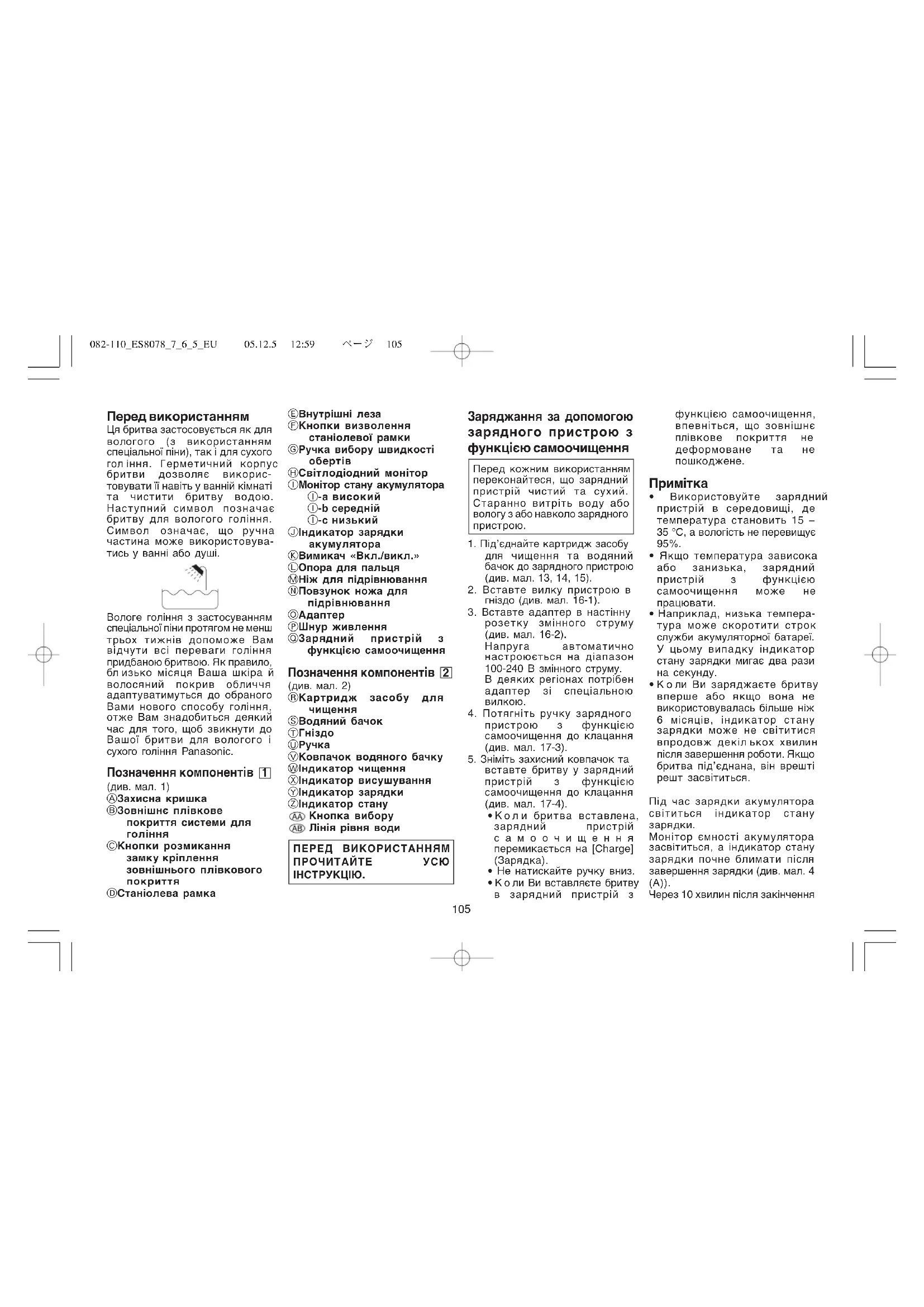 082-110ES8078765EU 05.12.5 12:59 ページ104Заряджання за допомогою зарядного пристрою з функцією самоочищення Перед кожним використанням переконайтеся, що зарядний пристрій чистий та сухий. Старанно витріть воду або вологу з або навколо зарядного