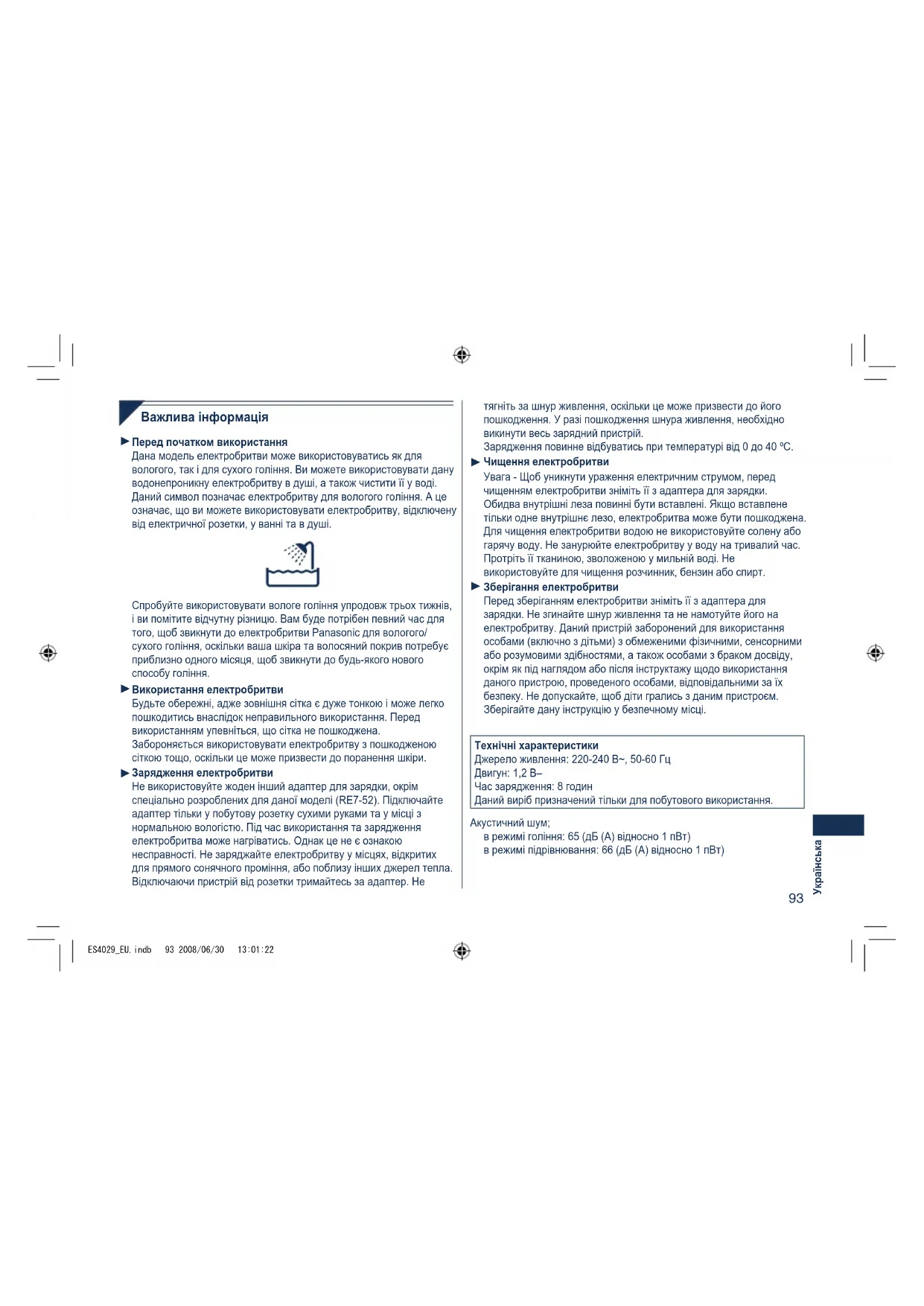 Важливаінформація Передпочаткомвикористання Дана модель електробритви може використовуватись як для вологого, так і для сухого гоління. Ви можете використовувати дану водонепроникну електробритву в душі, а також чистити її у воді. Даний символ позначає електробритву для вологого гоління. А це означає, що ви можете використовувати електробритву, відключену від електричної розетки, у ванні та в душі. Спробуйте використовувати вологе гоління упродовж трьох тижнів, і ви помітите відчутну різницю. Вам буде потрібен певний час для того, щоб звикнути до електробритви Panasonic для вологого/ сухого гоління, оскільки ваша шкіра та волосяний покрив потребує приблизно одного місяця, щоб звикнути до будь-якого нового способу гоління. Використанняелектробритви Будьте обережні, адже зовнішня сітка є дуже тонкою і може легко пошкодитись внаслідок неправильного використання. Перед використанням упевніться, що сітка не пошкоджена. Забороняється використовувати електробритву з пошкодженою сіткою тощо, оскільки це може призвести до поранення шкіри. Зарядженняелектробритви Не використовуйте жоден інший адаптер для зарядки, окрім спеціально розроблених для даної моделі (RE7-52). Підключайте адаптер тільки у побутову розетку сухими руками та у місці з нормальною вологістю. Під час використання та зарядження електробритва може нагріватись. Однак це не є ознакою несправності. Не заряджайте електробритву у місцях, відкритих для прямого сонячного проміння, або поблизу інших джерел тепла. Відключаючи пристрій від розетки тримайтесь за адаптер. Не