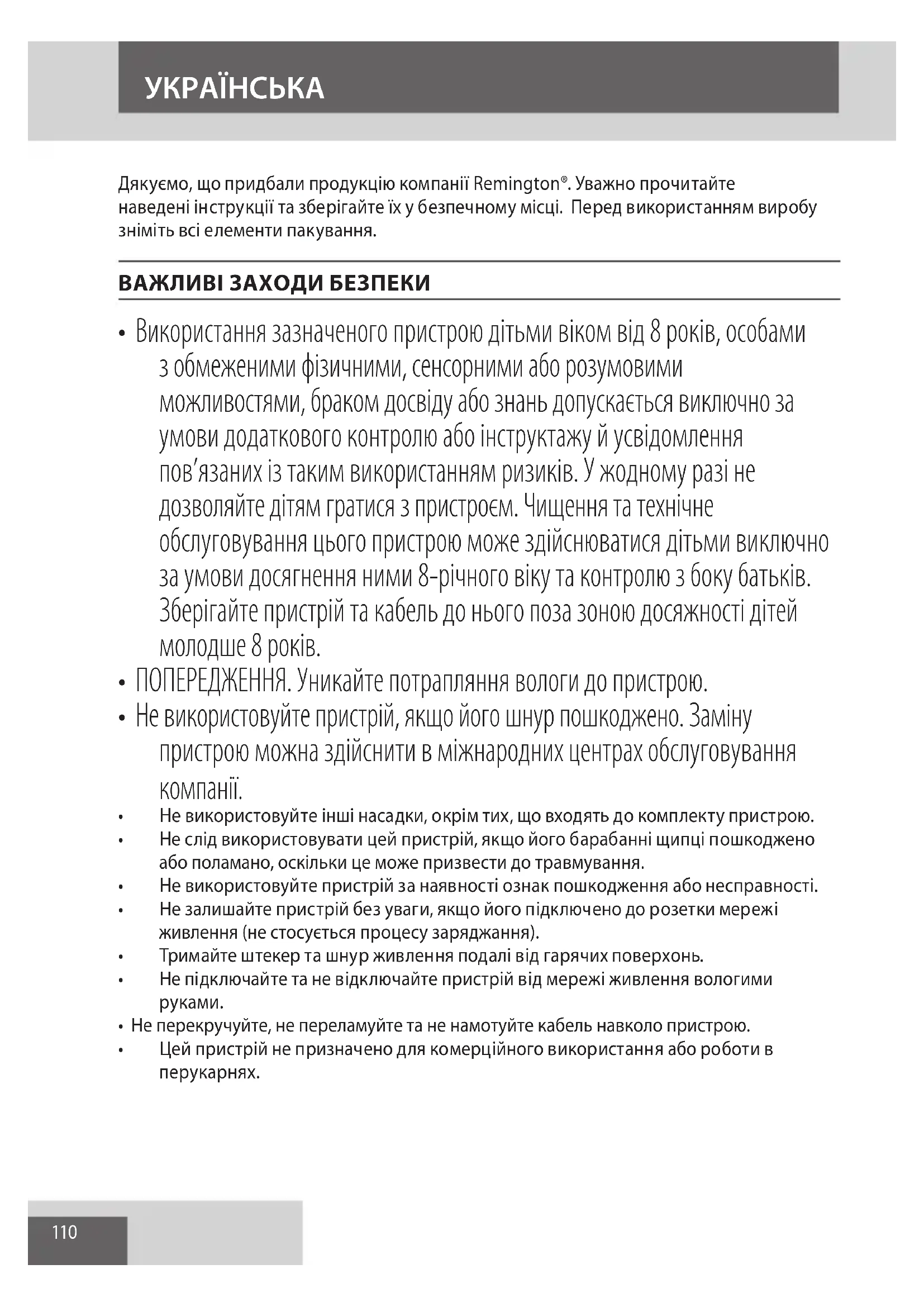 Щоб не завдати шкоди довкіллю та здоров’ю людей через дію небезпечних речовин, не слід утилізувати пристрої й батареї одноразового або багаторазового використання, що позначені одним із цих символів, разом із невідсортованим побутовим сміттям. Обов’язково утилізуйте електричні й електронні вироби, а також, де можливо, батареї одноразового або багаторазового використання у відповідному офіційному пункті переробки/збору.116 Благодарим Ви, че закупихте нов продукт на Remington. Моля, прочетете внимателно инструкцията за употреба и я запазете. Отстранете всички опаковки преди употреба. ВАЖНИ ИНСТРУКЦИИ ЗА БЕЗОПАСНОСТ