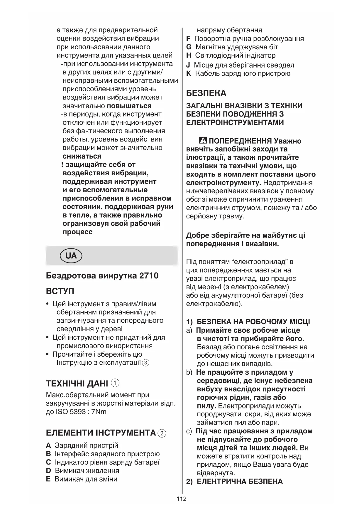 ТА КОРИСТУВАННЯ ЕЛЕКТРОПРИЛАДАМИ a) Не перевантажуйте прилад. Використовуйте такий прилад, що спеціально призначений для певної роботи. З придатним приладом Ви з меншим ризиком отримаєте кращі результати роботи, якщо будете працювати в зазначеному діапазоні потужності. b) Не користуйтеся приладом з пошкодженим вимикачем. Прилад, який не можна увімкнути або вимкнути, є небезпечним і його треба відремонтувати. c) Перед тим, як регулювати що-небудь на приладі, міняти приладдя або ховати прилад, витягніть штепсель із розетки та/або витягніть акумуляторну батарею, якщо вона знімається. Ці попереджувальні заходи з техніки безпеки зменшують ризик ненавмисного запуску приладу. d) Зберігайте електроприлади, якими Ви саме не користуєтесь, далеко від дітей. Не дозволяйте користуватися електроприладом особам, що не знайомі з його роботою або не читали ці вказівки. У разі застосування недосвідченими особами прилади несуть в собі небезпеку. e) Старанно доглядайте за електроінструментами і приладдям. Перевірте, щоб рухомі деталі приладу бездоганно працювали та не заїдали, не були поламаними або настільки пошкодженими, щоб це могло вплинути на функціонування приладу. Пошкоджені деталі треба відремонтувати в авторизованій майстерні, перш ніж ними можна115 ВКАЗІВКИ ПО БЕЗПЕЦІ ДЛЯ ВИКРУТКИ З АКУМУЛЯТОРНИМ