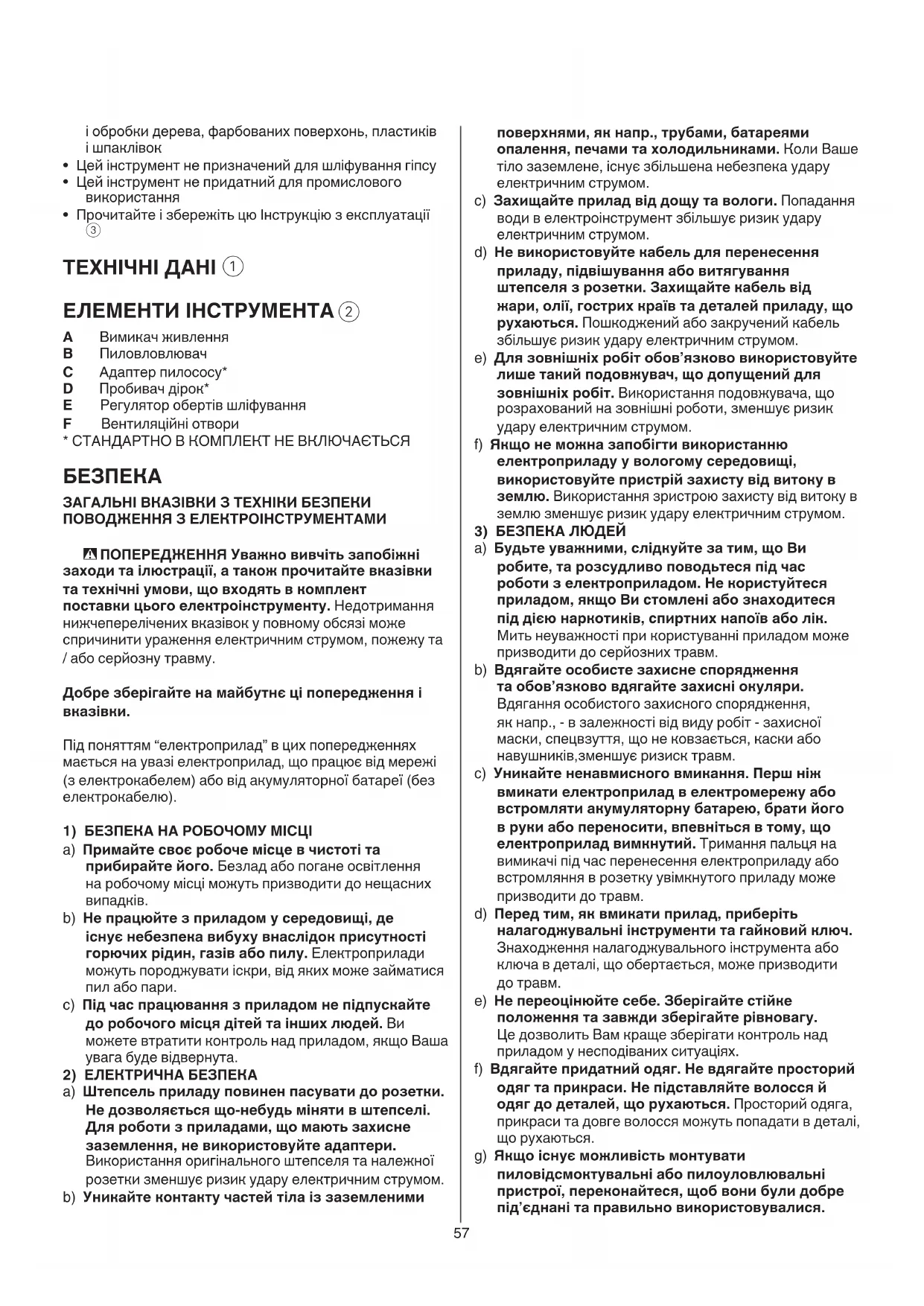 ЗАГАЛЬНІ ВКАЗІВКИ З ТЕХНІКИ БЕЗПЕКИ ПОВОДЖЕННЯ З ЕЛЕКТРОІНСТРУМЕНТАМИ - ПОПЕРЕДЖЕННЯ Уважно вивчіть запобіжні заходи та ілюстрації, а також прочитайте вказівки та технічні умови, що входять в комплект поставки цього електроінструменту. Недотримання нижчеперелічених вказівок у повному обсязі може спричинити ураження електричним струмом, пожежу та / або серйозну травму. Добре зберігайте на майбутнє ці попередження і