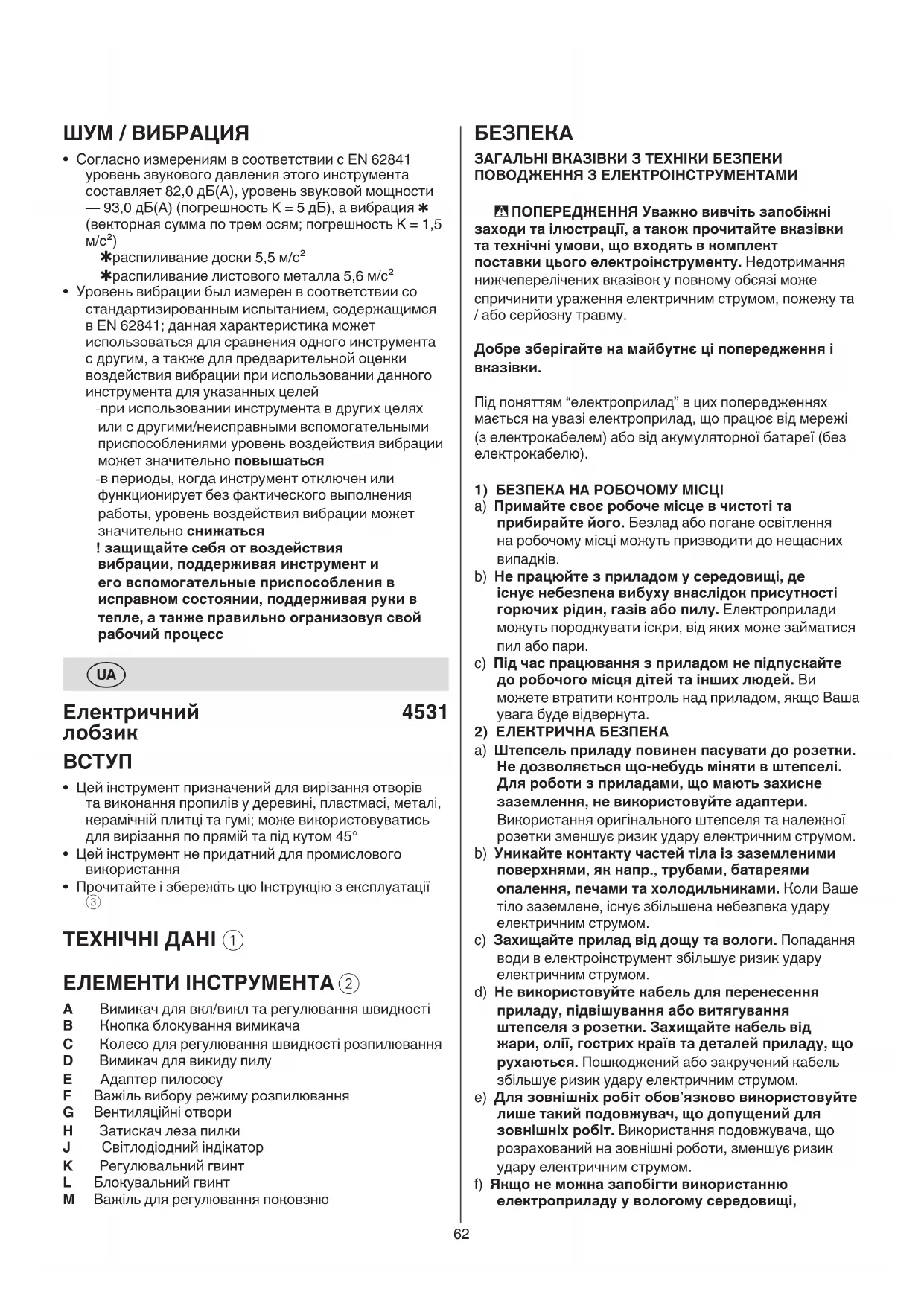 A Вимикач для вкл/викл та регулювання швидкості B Кнопка блокування вимикача C Колесо для регулювання швидкості розпилювання D Вимикач для викиду пилу E Aдаптер пилососy F Важіль вибору режиму розпилювання G Вентиляційні отвори H Затискач леза пилки J Світлодіодний індікатор K Регулювальний гвинт L Блокувальний гвинт M Важіль для регулювання поковзню63 приладі, міняти приладдя або ховати прилад, витягніть штепсель із розетки та/або витягніть акумуляторну батарею, якщо вона знімається. Ці попереджувальні заходи з техніки безпеки зменшують ризик ненавмисного запуску приладу. d) Зберігайте електроприлади, якими Ви саме не користуєтесь, далеко від дітей. Не дозволяйте користуватися електроприладом особам, що не знайомі з його роботою або не читали ці вказівки. У разі застосування недосвідченими особами прилади несуть в собі небезпеку. e) Старанно доглядайте за електроінструментами і приладдям. Перевірте, щоб рухомі деталі приладу бездоганно працювали та не заїдали, не були поламаними або настільки пошкодженими, щоб це могло вплинути на функціонування приладу. Пошкоджені деталі треба відремонтувати в авторизованій майстерні, перш ніж ними можна знову користуватися. Велика кількість нещасних випадків спричиняється поганим доглядом за електроприладами. f) Тримайте різальні інструменти добре нагостреними та в чистоті. Старанно доглянуті різальні інструменти з гострим різальним краєм менше застряють та їх легше вести. g) Використовуйте електроприлади, приладдя до них, робочі інструменти т.і. відповідно до цих вказівок. Беріть до уваги при цьому умови роботи та специфіку виконуваної роботи. Використання електроприладів для робіт, для яких вони не передбачені, може призводити до небезпечних ситуацій. h) Тримайте рукоятки і поверхні захвату сухими і чистими, слідкуйте, щоб на них не було оливи або густого мастила. Слизькі рукоятки і поверхні захвату унеможливлюють безпечне поводження з електроінструментом та його контролювання в неочікуваних ситуаціях.
