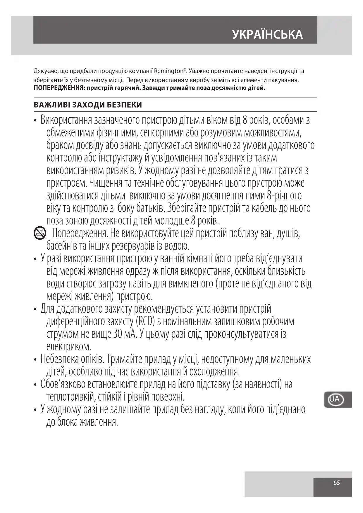 Kako bi se izbjegle štetne posljedice na okoliš i zdravlje zbog opasnih supstanci, uređaji i punjive i nepunjive baterije obilježene jednim od ovih simbola ne smiju se zbrinjavati kao nerazvrstani komunalni otpad. Uvijek odložite električne i elektroničke proizvode i , gdje je primjenljivo, punjive i nepunjive baterije, u odgovarajućem zvaničnom mjestu za sakupljanje/reciklažu.65 Дякуємо, що придбали продукцію компанії Remington®. Уважно прочитайте наведені інструкції та зберігайте їх у безпечному місці. Перед використанням виробу зніміть всі елементи пакування. ПОПЕРЕДЖЕННЯ: пристрій гарячий. Завжди тримайте поза досяжністю дітей. ВАЖЛИВІ ЗАХОДИ БЕЗПЕКИ