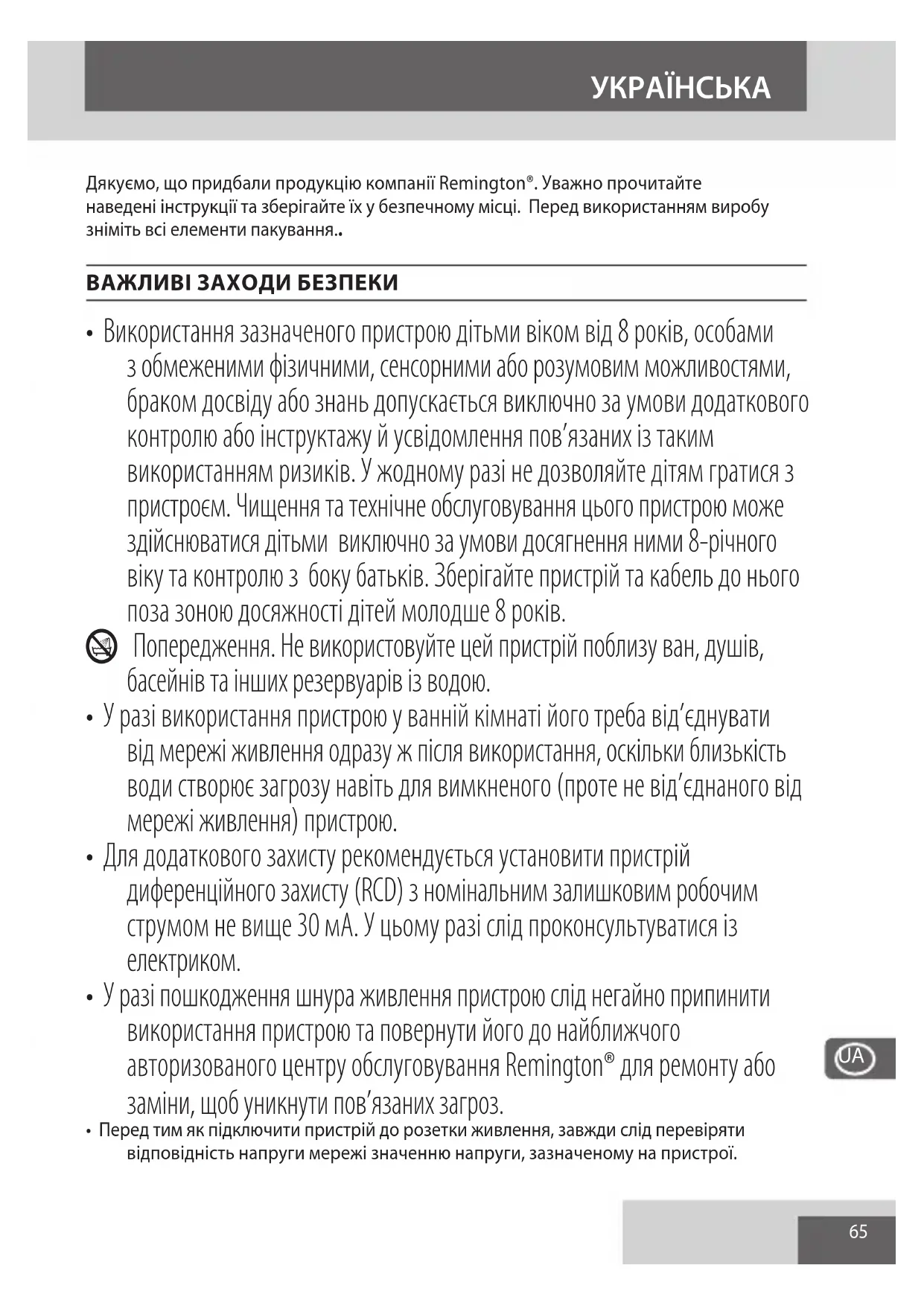 Дякуємо, що придбали продукцію компанії Remington®. Уважно прочитайте наведені інструкції та зберігайте їх у безпечному місці. Перед використанням виробу зніміть всі елементи пакування.. ВАЖЛИВІ ЗАХОДИ БЕЗПЕКИ