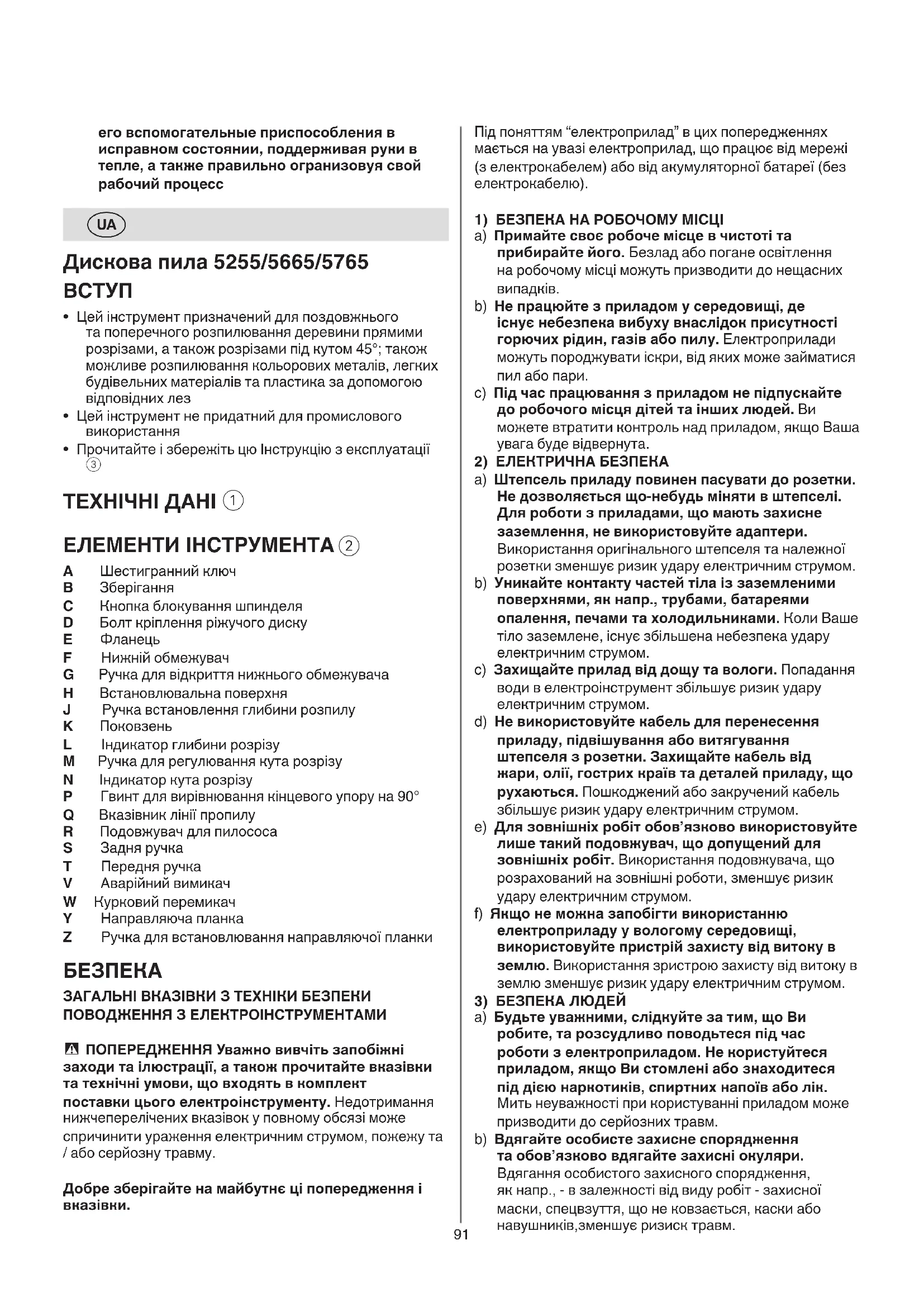 ЗАГАЛЬНІ ВКАЗІВКИ З ТЕХНІКИ БЕЗПЕКИ ПОВОДЖЕННЯ З ЕЛЕКТРОІНСТРУМЕНТАМИ - ПОПЕРЕДЖЕННЯ Уважно вивчіть запобіжні заходи та ілюстрації, а також прочитайте вказівки та технічні умови, що входять в комплект поставки цього електроінструменту. Недотримання нижчеперелічених вказівок у повному обсязі може спричинити ураження електричним струмом, пожежу та / або серйозну травму. Добре зберігайте на майбутнє ці попередження і вказівки.92 відремонтувати в авторизованій майстерні, перш ніж ними можна знову користуватися. Велика кількість нещасних випадків спричиняється поганим доглядом за електроприладами. f) Тримайте різальні інструменти добре нагостреними та в чистоті. Старанно доглянуті різальні інструменти з гострим різальним краєм менше застряють та їх легше вести. g) Використовуйте електроприлади, приладдя до них, робочі інструменти т.і. відповідно до цих вказівок. Беріть до уваги при цьому умови роботи та специфіку виконуваної роботи. Використання електроприладів для робіт, для яких вони не передбачені, може призводити до небезпечних ситуацій. h) Тримайте рукоятки і поверхні захвату сухими і чистими, слідкуйте, щоб на них не було оливи або густого мастила. Слизькі рукоятки і поверхні захвату унеможливлюють безпечне поводження з електроінструментом та його контролювання в неочікуваних ситуаціях.