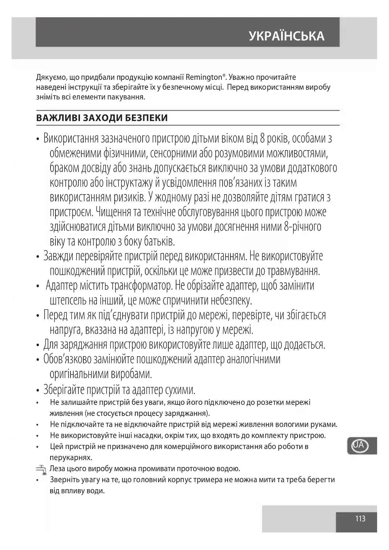 - Цей пристрій не призначено для комерційного використання або роботи в перукарнях. Леза цього виробу можна промивати проточною водою.