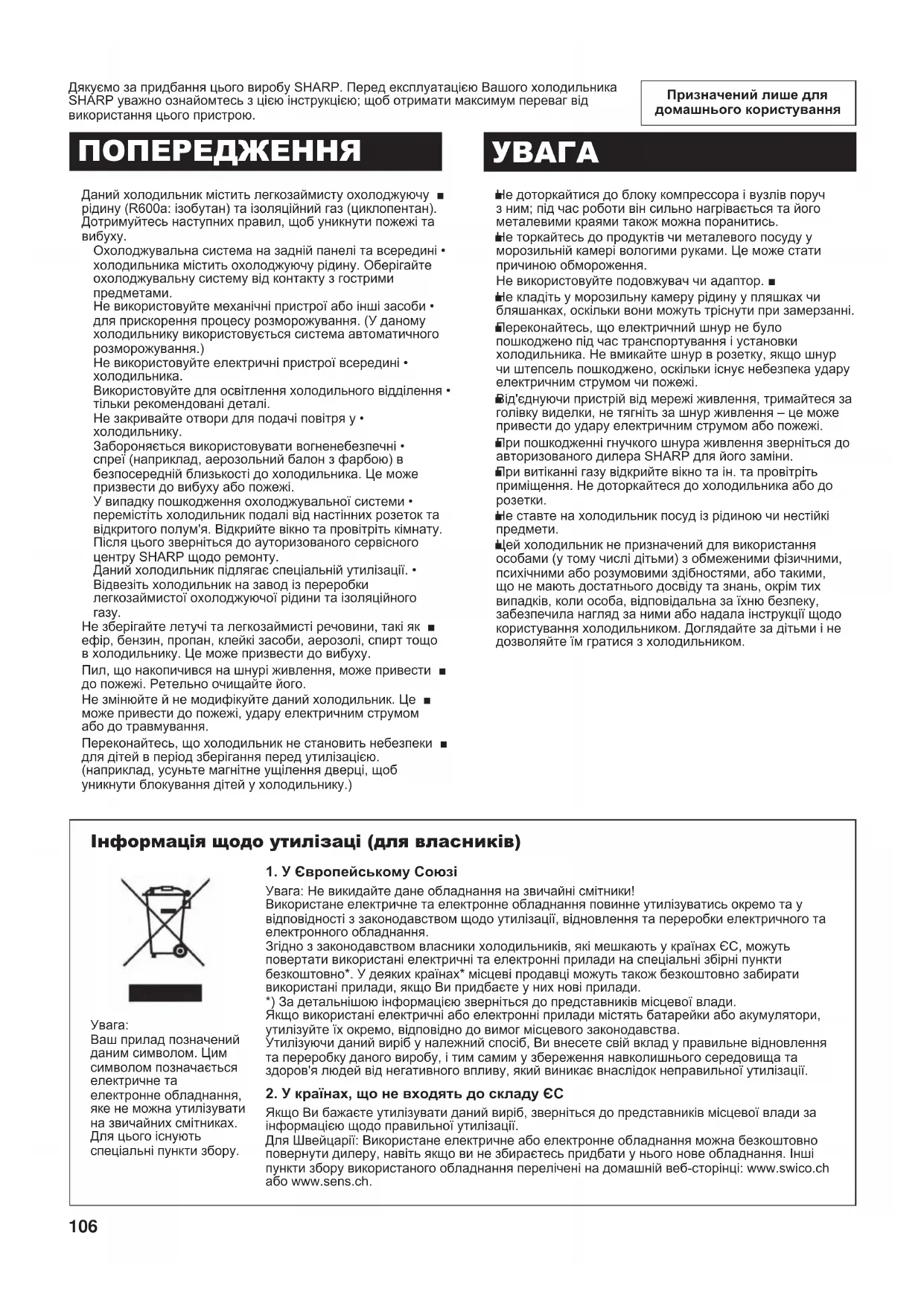 (B246)-E.indb 105 2011/09/01 10:12:02106 Призначений лише для домашнього користування Дякуємо за придбання цього виробу SHARP. Перед експлуатацією Вашого холодильника SHARP уважно ознайомтесь з цією інструкцією; щоб отримати максимум переваг від використання цього пристрою. Даний холодильник містить легкозаймисту охолоджуючу ■ рідину (R600a: ізобутан) та ізоляційний газ (циклопентан). Дотримуйтесь наступних правил, щоб уникнути пожежі та