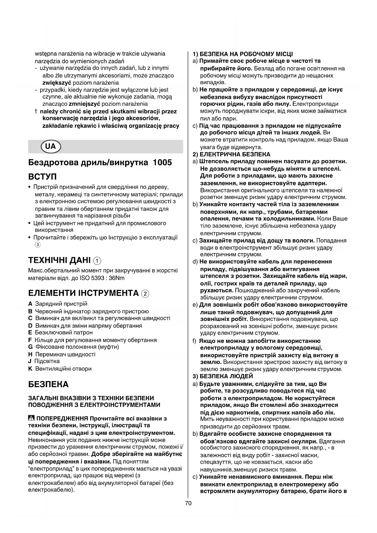Невиконання усіх поданих нижче інструкцій може призвести до ураження електричним струмом, пожежі і/ або серйозної травми. Під поняттям “електроприлад” в цих попередженнях мається на увазі електроприлад, що працює від мережі (з електрокабелем) або від акумуляторної батареї (без електрокабелю).