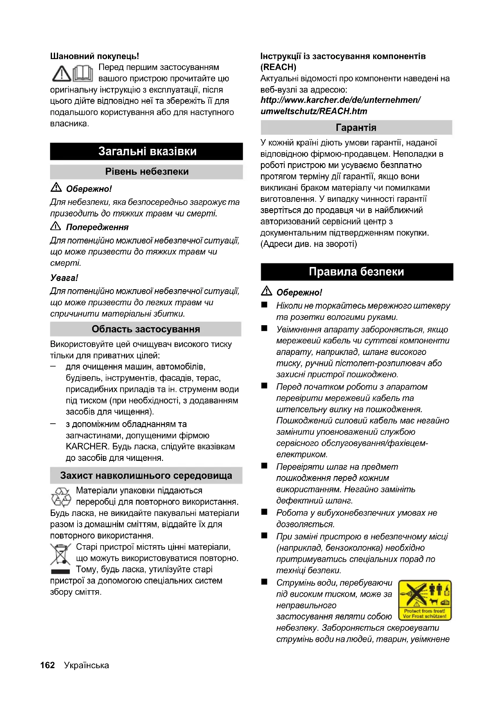пристрої за допомогою спеціальних систем збору сміття. Інструкції із застосування компонентів (REACH) Актуальні відомості про компоненти наведені на веб-вузлі за адресою: http://www.karcher.de/de/unternehmen/ umweltschutz/REACH.htm У кожній країні діють умови гарантії, наданої відповідною фірмою-продавцем. Неполадки в роботі пристрою ми усуваємо безплатно протягом терміну дії гарантії, якщо вони викликані браком матеріалу чи помилками виготовлення. У випадку чинності гарантії звертіться до продавця чи в найближчий авторизований сервісний центр з документальним підтвердженням покупки. (Адреси див. на звороті)