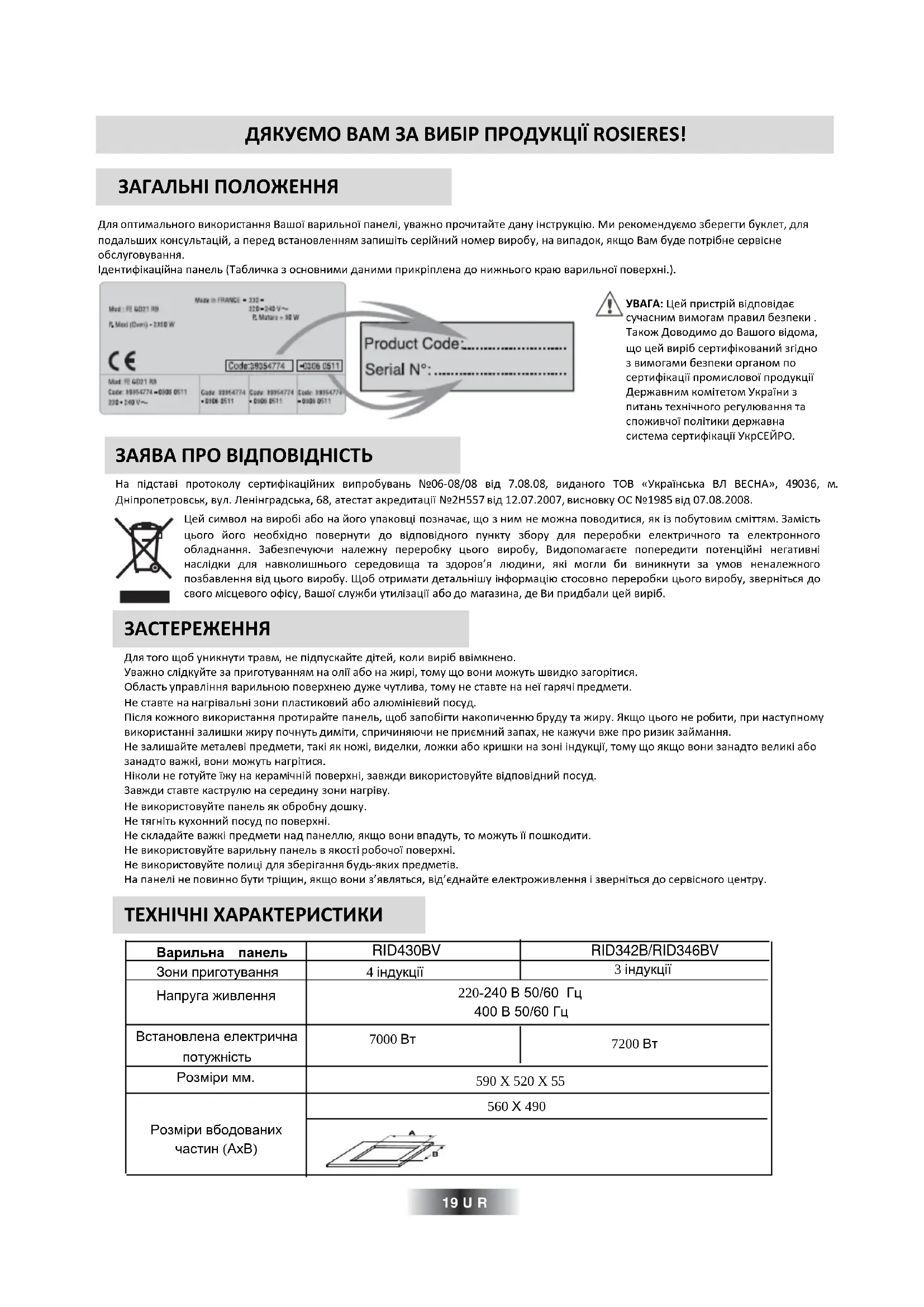 - Les cycles coupure-fonctionnement varient en fonction du niveau de puissance demandé : - niveau faible : temps de fonctionnement court, - niveau élevé : temps de fonctionnement long. 30° Maxi Cet appareil est commercialisé en accord avec la directive européenne 2012/19/EU sur les déchets des équipements électriques et électroni- ques (DEEE). En vous assurant que ce produit est correctement recyclé, vous participez à la prévention des conséquences négatives sur l’environnement et la santé publique qui pourrait être causé par une mise au rebut inappropriée de ce produit. Le symbole sur ce produit indique qu’il ne doit pas être traité comme un déchet ménager. Il doit être rapporté jusqu’à un point de recyclage des déchets électriques et électroniques. La collecte de ce produit doit se faire en accord avec les règlementations environnementales concernant la mise au rebut de ce type de déchets. Pour plus d’information au sujet du traitement, de la collecte et du recyclage de ce produit, merci de contacter votre mairie, votre centre de traitement des déchets ou le magasin où vous avez acheté ce produit.ДЯКУЄМО ВАМ ЗА ВИБІР ПРОДУКЦІЇ ROSIERES! ЗАГАЛЬНІ ПОЛОЖЕННЯ Длѐ оптимального використаннѐ Вашої варильної панелі, уважно прочитайте дану інструкція. Ми рекомендуюмо зберегти буклет, длѐ подальших консультацій, а перед встановленнѐм запишіть серійний номер виробу, на випадок, ѐкщо Вам буде потрібне сервісне обслуговуваннѐ. Ідентифікаційна панель (Табличка з основними даними прикріплена до нижнього края варильної поверхні.). ЗАСТЕРЕЖЕННЯ УВАГА: Цей пристрій відповідаюсучасним вимогам правил безпеки .Також Доводимо до Вашого відома,що цей виріб сертифікований згідноз вимогами безпеки органом посертифікації промислової продукціїДержавним комітетом України зпитань технічного регуляваннѐ таспоживчої політики державнасистема сертифікації УкрСЕЙРО. ЗАЯВА ПРО ВІДПОВІДНІСТЬ На підставі протоколу сертифікаційних випробувань №06-08/08 від 7.08.08, виданого ТОВ «Українська ВЛ ВЕСНА», 49036, м. Дніпропетровськ, вул. Ленінградська, 68, атестат акредитації №2Н557 від 12.07.2007, висновку ОС №1985 від 07.08.2008. Цей символ на виробі або на його упаковці позначаю, що з ним не можна поводитисѐ, ѐк із побутовим сміттѐм. Замість цього його необхідно повернути до відповідного пункту збору длѐ переробки електричного та електронного обладнаннѐ. Забезпечуячи належну переробку цього виробу, Видопомагаюте попередити потенційні негативні наслідки длѐ навколишнього середовища та здоров’ѐ лядини, ѐкі могли би виникнути за умов неналежного позбавленнѐ від цього виробу. Щоб отримати детальнішу інформація стосовно переробки цього виробу, звернітьсѐ до свого місцевого офісу, Вашої служби утилізації або до магазина, де Ви придбали цей виріб. Длѐ того щоб уникнути травм, не підпускайте дітей, коли виріб ввімкнено. Уважно слідкуйте за приготуваннѐм на олії або на жирі, тому що вони можуть швидко загорітисѐ. Область управліннѐ варильноя поверхнея дуже чутлива, тому не ставте на неї гарѐчі предмети. Не ставте на нагрівальні зони пластиковий або алямініювий посуд. Післѐ кожного використаннѐ протирайте панель, щоб запобігти накопичення бруду та жиру. Якщо цього не робити, при наступному використанні залишки жиру почнуть диміти, спричинѐячи не приюмний запах, не кажучи вже про ризик займаннѐ. Не залишайте металеві предмети, такі ѐк ножі, виделки, ложки або кришки на зоні індукції, тому що ѐкщо вони занадто великі або занадто важкі, вони можуть нагрітисѐ. Ніколи не готуйте їжу на керамічній поверхні, завжди використовуйте відповідний посуд. Завжди ставте каструля на середину зони нагріву. Не використовуйте панель ѐк обробну дошку.Не тѐгніть кухонний посуд по поверхні. Не складайте важкі предмети над панелля, ѐкщо вони впадуть, то можуть її пошкодит