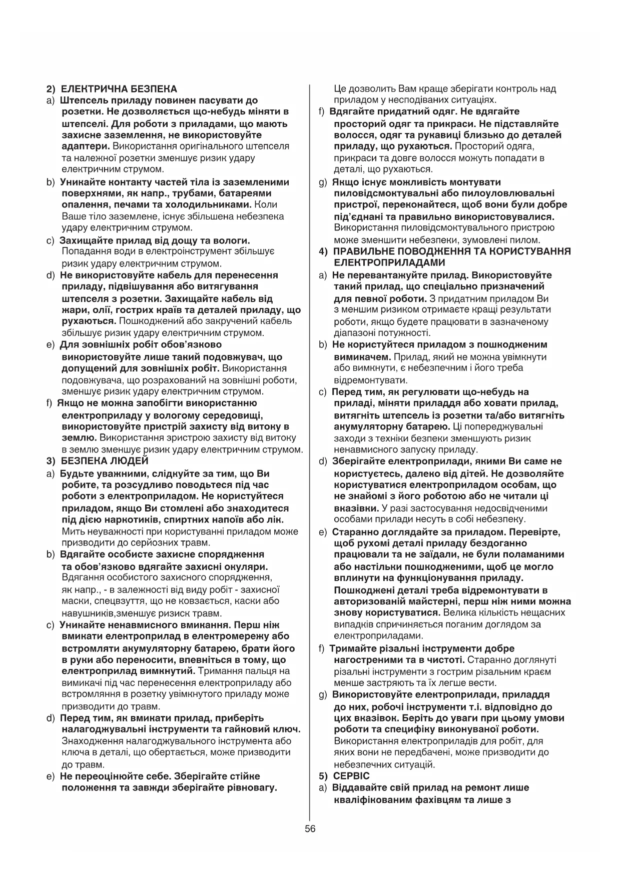 b) Не працюйте з приладом у середовищі, де існує небезпека вибуху внаслідок присутності горючих рідин, газів або пилу. Електроприлади можуть породжувати іскри, від яких може займатися пил або пари. c) Під час працювання з приладом не підпускайте до робочого місця дітей та інших людей. Ви можете втратити контроль над приладом, якщо Ваша увага буде відвернута.56