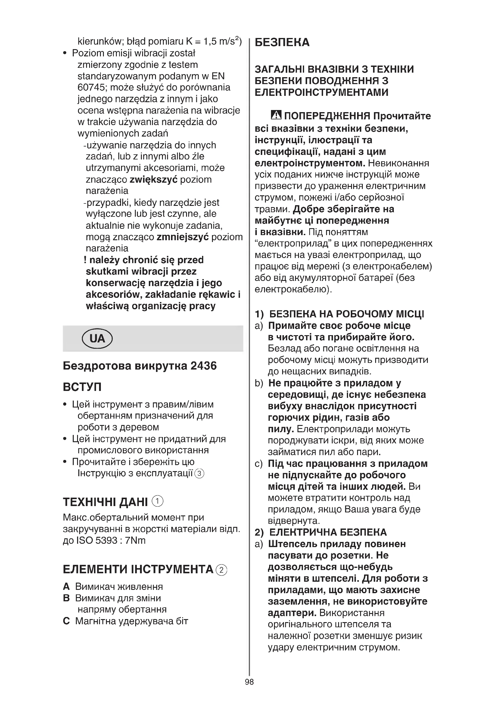 A Вимикач живлення B Вимикач для зміни напряму обертання C Магнітна удержувача біт99 що не ковзається, каски або навушників,зменшує ризиск травм. c) Уникайте ненавмисного вмикання. Перш ніж вмикати електроприлад в електромережу або встромляти акумуляторну батарею, брати його в руки або переносити, впевніться в тому, що електроприлад вимкнутий. Тримання пальця на вимикачі під час перенесення електроприладу або встромляння в розетку увімкнутого приладу може призводити до травм. d) Перед тим, як вмикати прилад, приберіть налагоджувальні інструменти та гайковий ключ. Знаходження налагоджувального інструмента або ключа в деталі, що обертається, може призводити